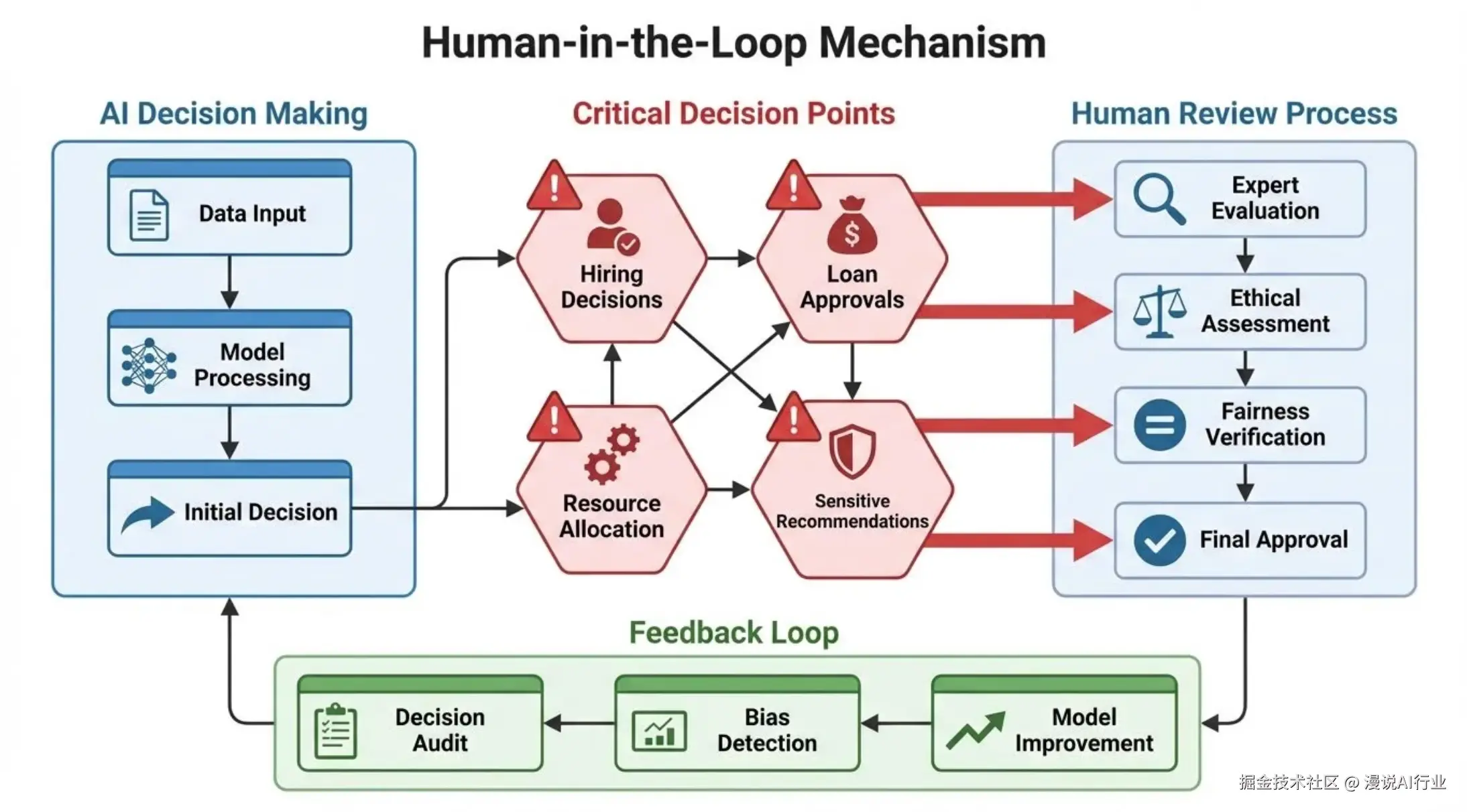 - 应对策略: 互联网公司需要建立严格的AI伦理审查流程。在数据层面,通过精细化的数据清洗和标注,尽可能消除偏见。在模型层面,采用对抗性训练等技术来提升模型的公平性。在应用层面,设计“人在回路”(Human-in-the-loop)机制,在关键决策点引入人工审核,确保最终结果的公正。