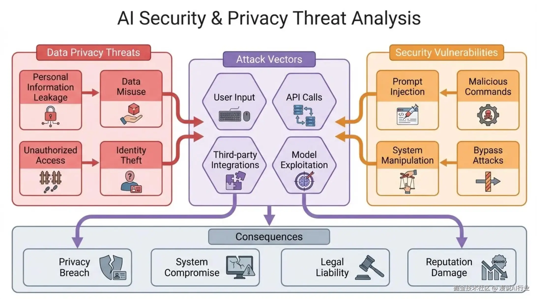 安全与隐私问题: 用户在与AI交互时输入的数据可能包含个人隐私,如何确保这些数据不被滥用或泄露是一个严峻挑战。此外,“提示词注入”(Prompt Injection)等新的攻击方式也对AI应用的安全提出了更高要求。