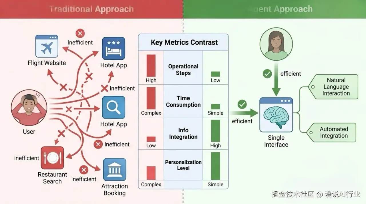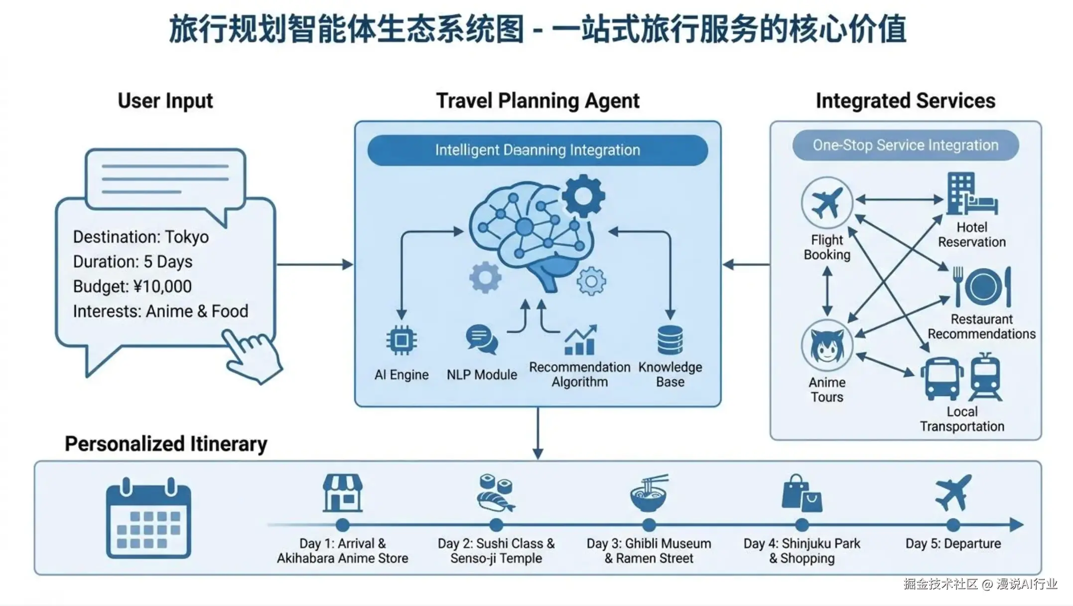以旅行规划 智能体 为例, 想象一下,用户不再需要分别打开多个网站搜索航班、预订酒店、查找餐厅,而只需对一个旅行规划智能体说:“帮我规划一个下个月去东京的5日自由行,预算1万元,我喜欢动漫和美食。”