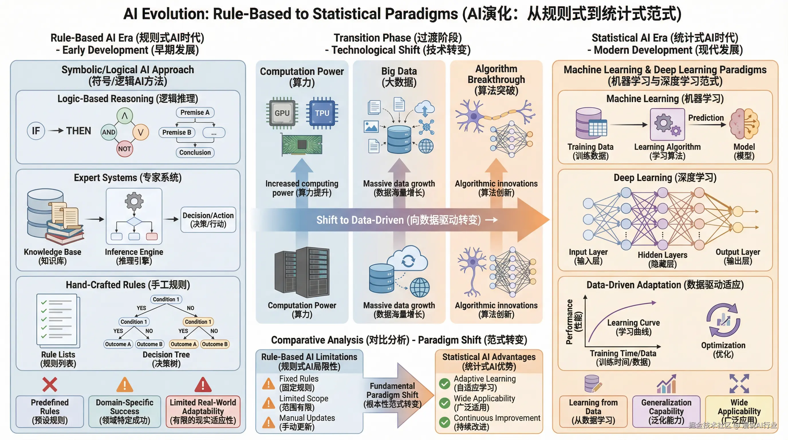 人工智能(AI)的发展并非一蹴而就,它经历了一条从理论萌芽到技术爆发的曲折路径。早期以逻辑推理和专家系统为代表的“规则式AI”,试图通过预设的规则库模拟人类专家的决策过程,在特定领域取得了初步成功。然而,它的局限性也显而易见——没有办法处理规则之外的复杂现实世界问题。随着算力的提升和数据的海量增长,以机器学习,特别是深度学习为核心的“统计式AI”时代到来,AI的发展范式发生了根本性转变。