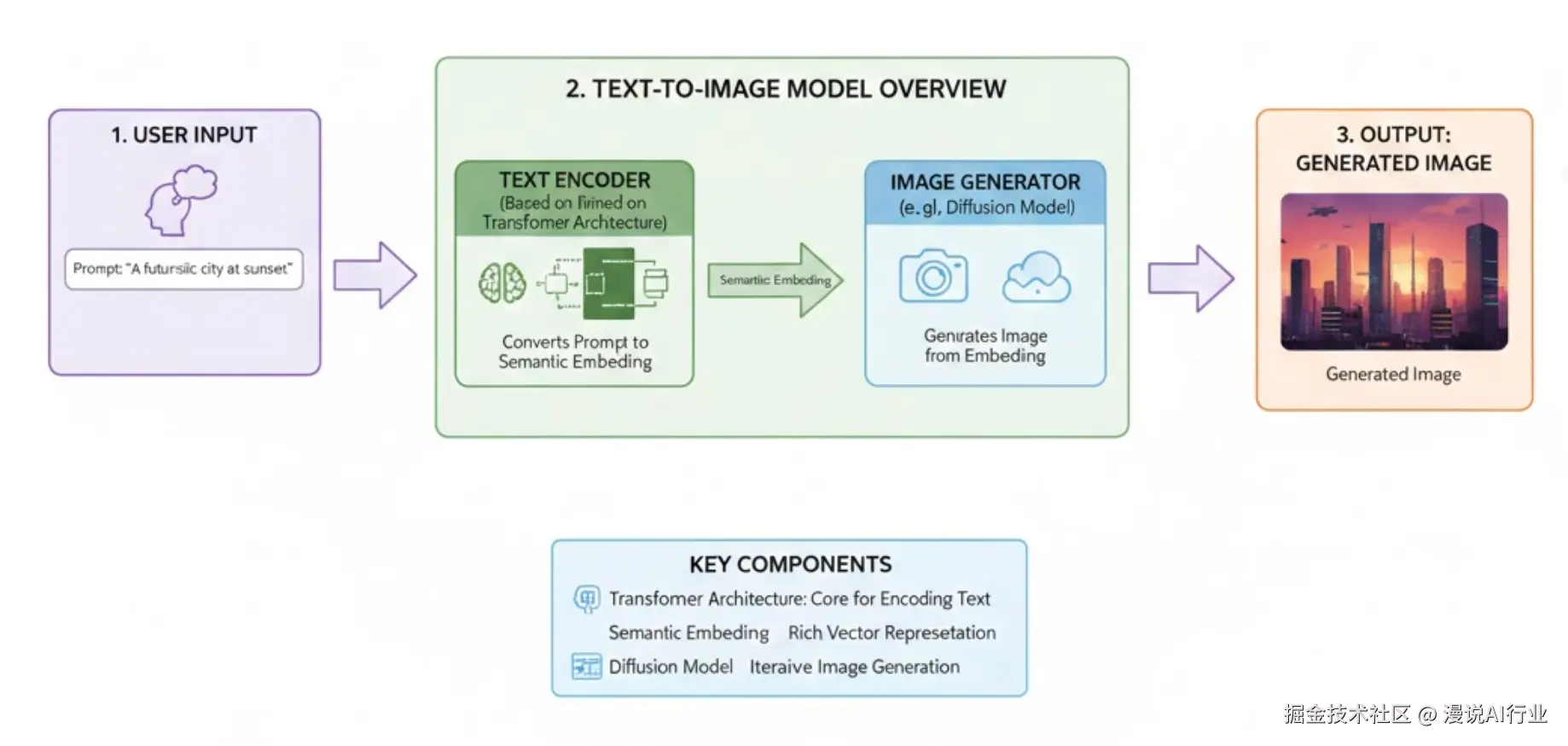 近年来火爆的“文生图”模型,如Stable Diffusion、Midjourney等,其背后同样离不开Transformer架构。这类模型通常包含一个文本编码器和一个图像生成器(如扩散模型)。