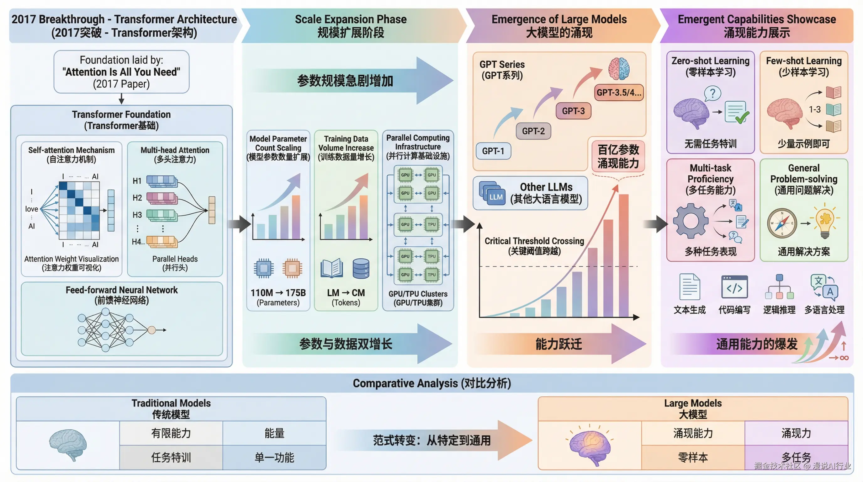 在Transformer架构奠定的基础上,通过急剧增加模型参数规模和训练数据量,人工智能领域迎来了“大模型”(Large Models)时代。以OpenAI的GPT(Generative Pre-trained Transformer)系列为代表的大语言模型(LLM),展示了惊人的“涌现能力”——当模型规模跨越某个阈值后,它们无需针对特定任务进行专门训练,就能在多种任务上表现出强大的通用问题解决能力(即零样本或少样本学习能力)。