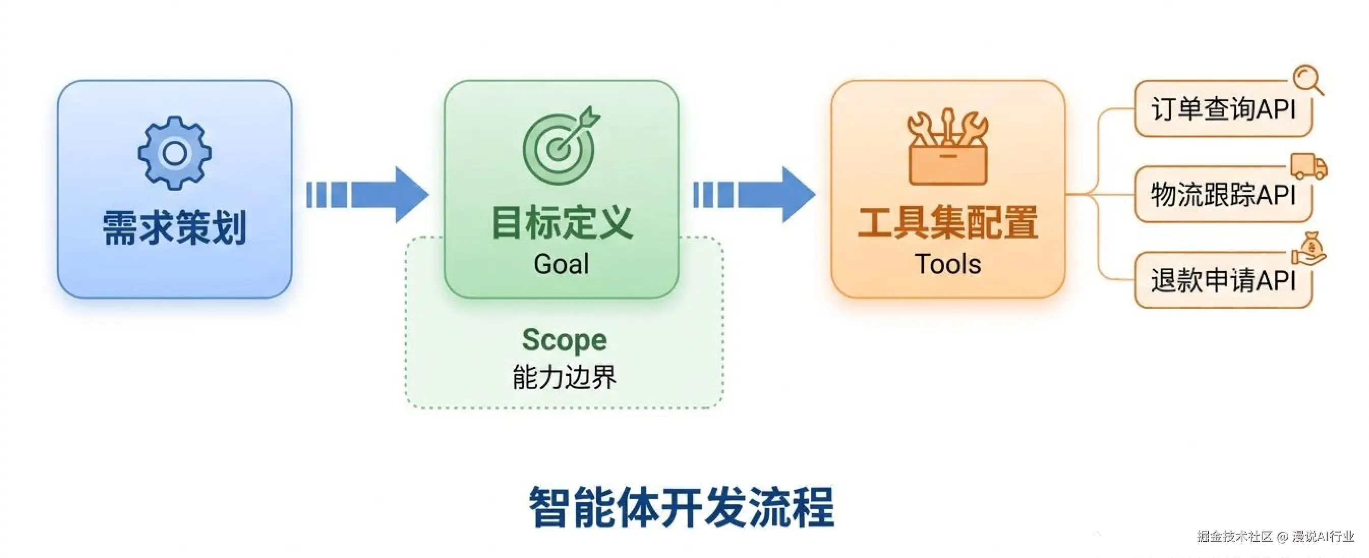 - 需求策划与目标定义: 这是最重要的一步。必须清晰地定义智能体的核心任务是什么(Goal),它的能力边界在哪里(Scope),以及它被允许使用的工具集(Tools)。例如,一个电商客服智能体的目标是解决售后问题,其工具集可能包括订单查询API、物流跟踪API和退款申请API。
