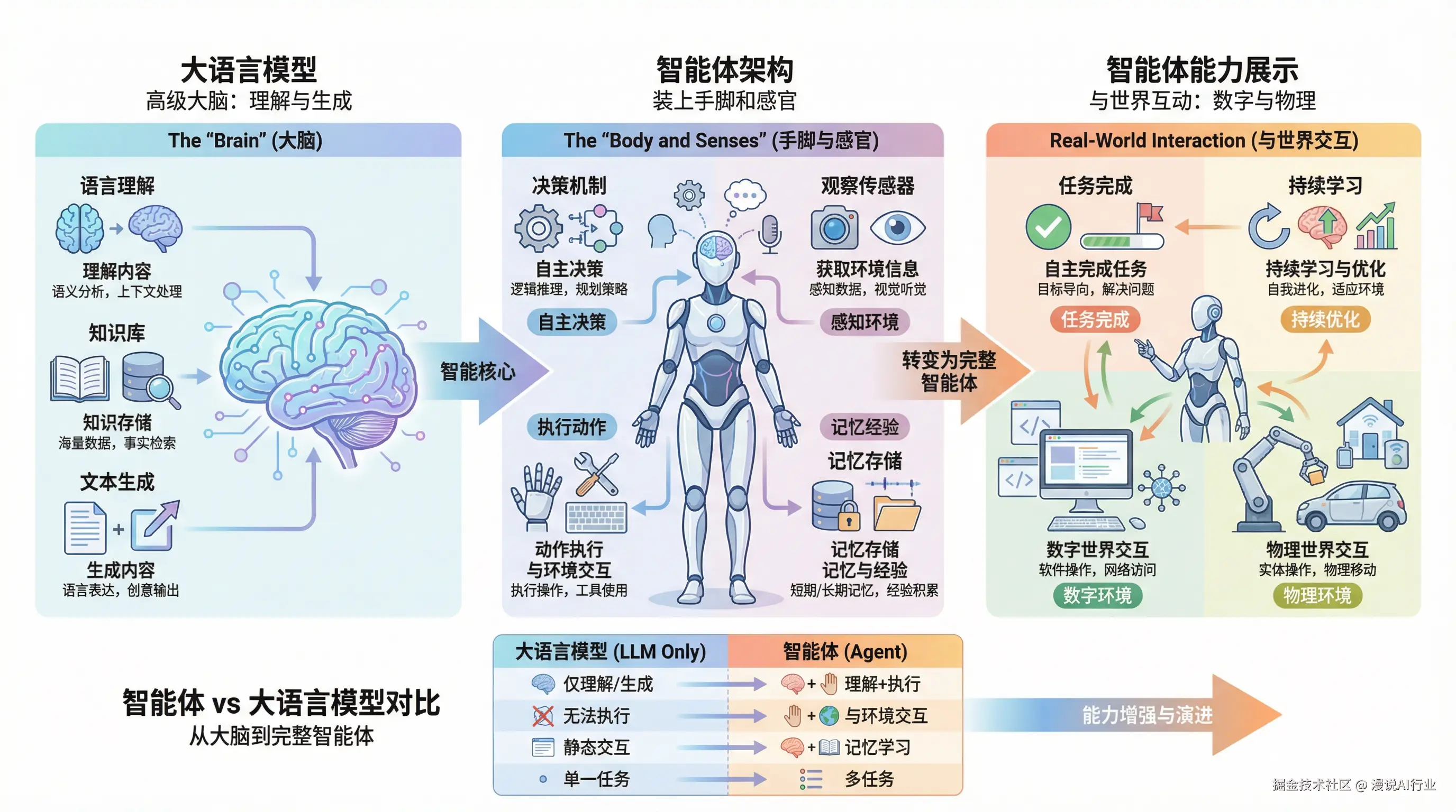 如果说大语言模型是能够理解和生成内容的高级“大脑”,那么智能体(Agent)则是在此基础上,为其装上了“手脚”和“感官”,使其能够与数字世界或物理世界进行交互,并自主完成任务。一个智能体可以被定义为一个遵循“感知-决策-行动”(Perception-Decision-Action)循环的系统。它能够感知环境(如用户指令、网页内容、API返回数据),基于其目标进行决策和规划(将复杂任务分解为一系列可执行的步骤),并最终调用工具(如浏览器、API、代码解释器)来行动。