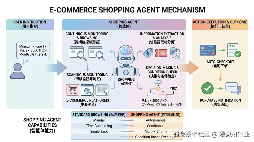 - 电商领域: 用户可以部署一个“购物智能体”,指令是“帮我监控全网iPhone 17的价格,一旦有平台价格低于8000元且提供24期免息,就自动下单购买”。这个智能体能持续浏览各大电商网站,分析商品页面,识别价格和优惠信息,并最终执行购买操作。