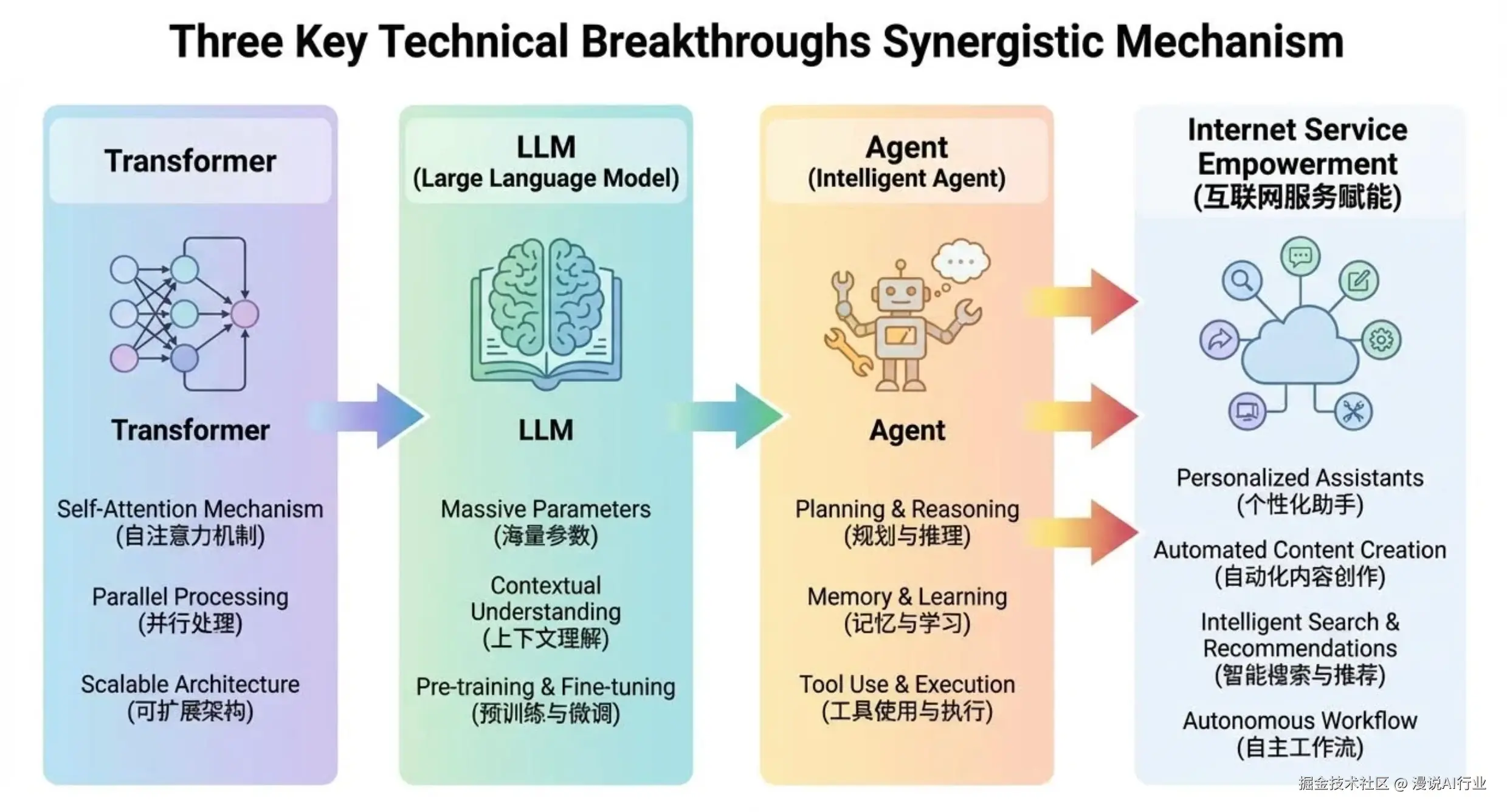 近年来,以 Transformer 架构、大语言模型( LLM ) 和 智能体 (Agent) 为代表的三大技术突破,更是将AI在互联网领域的应用推向了前所未有的高度。Transformer架构通过其革命性的自注意力机制,解决了长序列信息处理的难题,彻底改变了自然语言处理(NLP)的格局,并直接赋能了搜索引擎和内容生成等核心互联网服务。