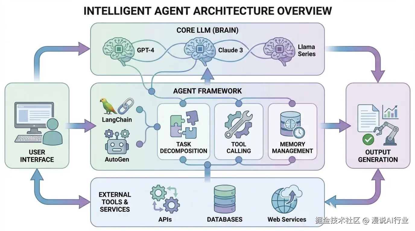 - 智能体 框架: 利用LangChain、AutoGen等开源框架,可以大大简化智能体的开发。这些框架提供了任务分解、工具调用、记忆管理等标准模块。