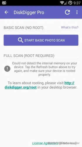 打开 DiskDigger 后,您会看到两个选项:“基本扫描”和“完整扫描”。完整扫描模式需要对您的Android手机进行 root 操作。