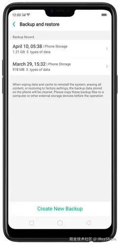 本地备份是 OPPO 备份和恢复的一个简单策略。然而,它可能是一个权宜之计,因为它将占用 OPPO 的一定存储空间,如果 OPPO 发生问题,可能会有一些意外的安全风险。同样,您最好不要在恢复过程中重新启动您的 OPPO,否则您的数据可能会丢失。- 将 OPPO 手机备份到手机存储:解锁您的 OPPO 并导航到设置 > 附加设置 > 备份和重置以打开 备份和恢复。您的手机将随后备份到手机存储。- 从存储中恢复 OPPO 手机:只需前往设置 > 附加设置 > 备份和重置 > 备份和恢复。从备份记录中选择所需的数据 - 个人数据、系统数据 和 应用程序,然后点击 开始恢复 以将您想要的数据恢复到您的 OPPO 手机。