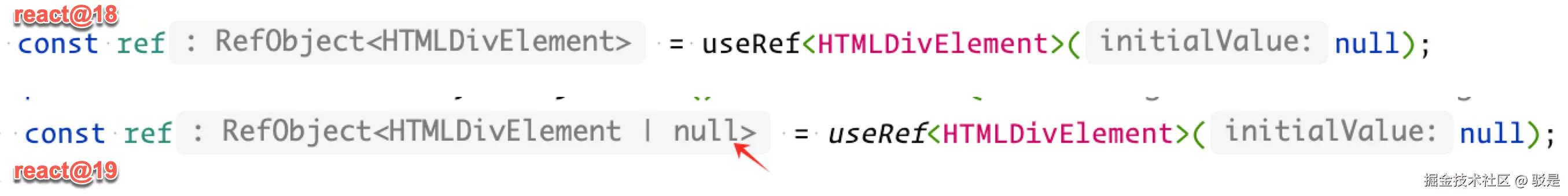 不过有一个好处,就是以前写成 useRef<T | null>(null) 的,现在只需要写 useRef<T>(null),见下图 React 18 和 19 下 IDE 类型推导的区别: