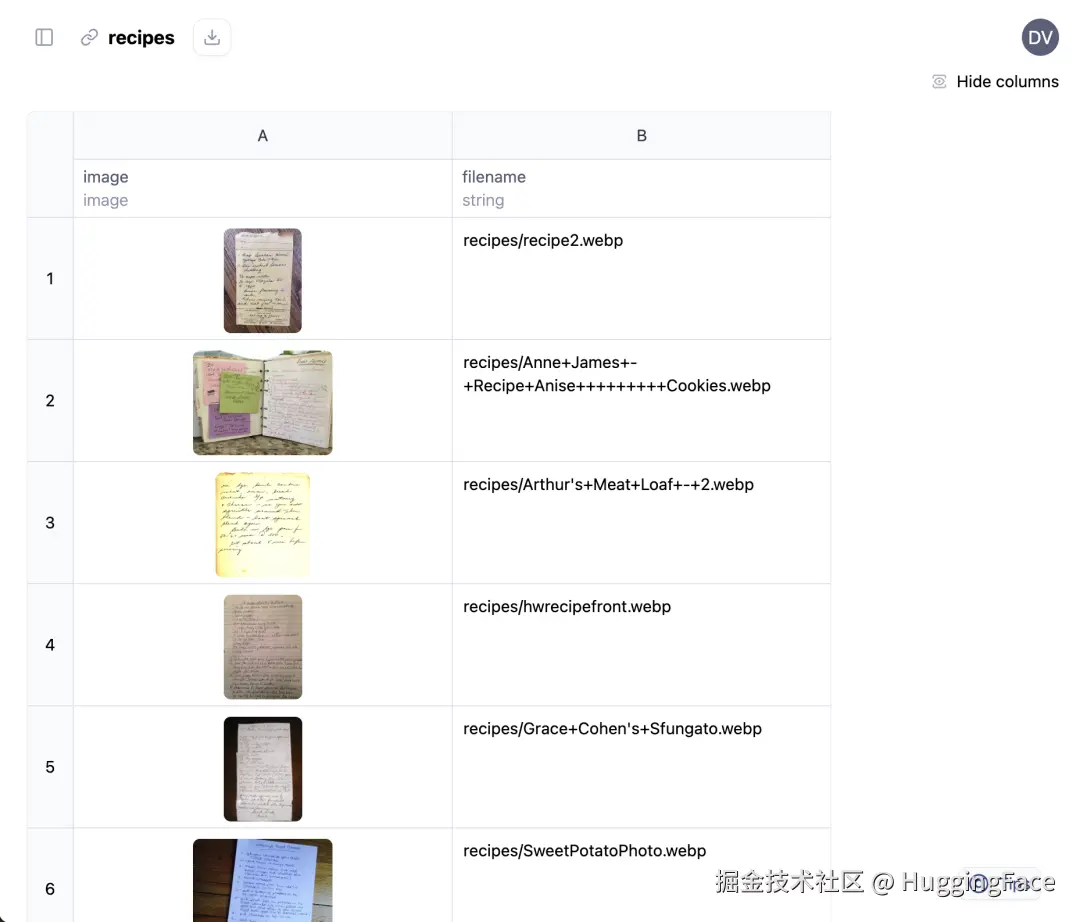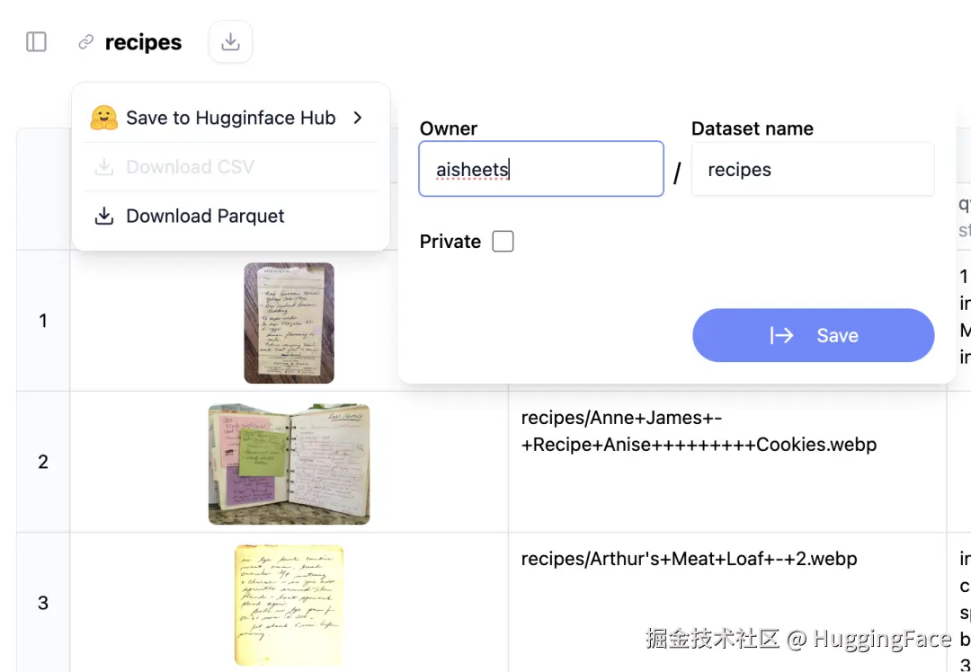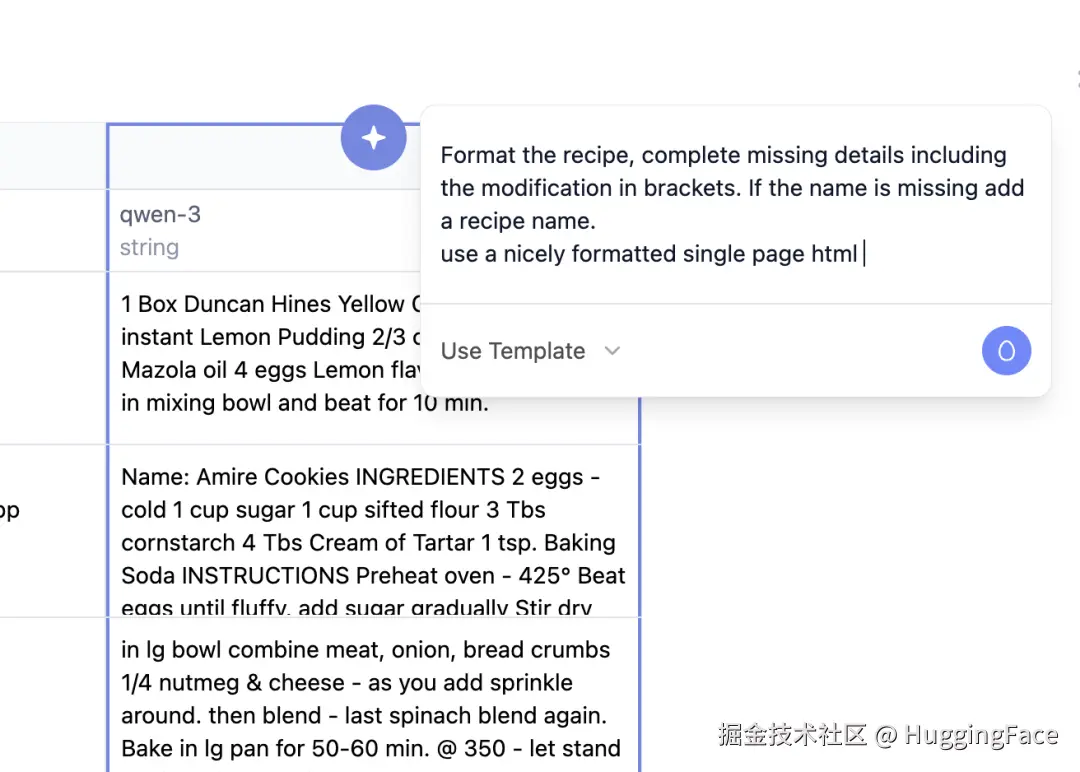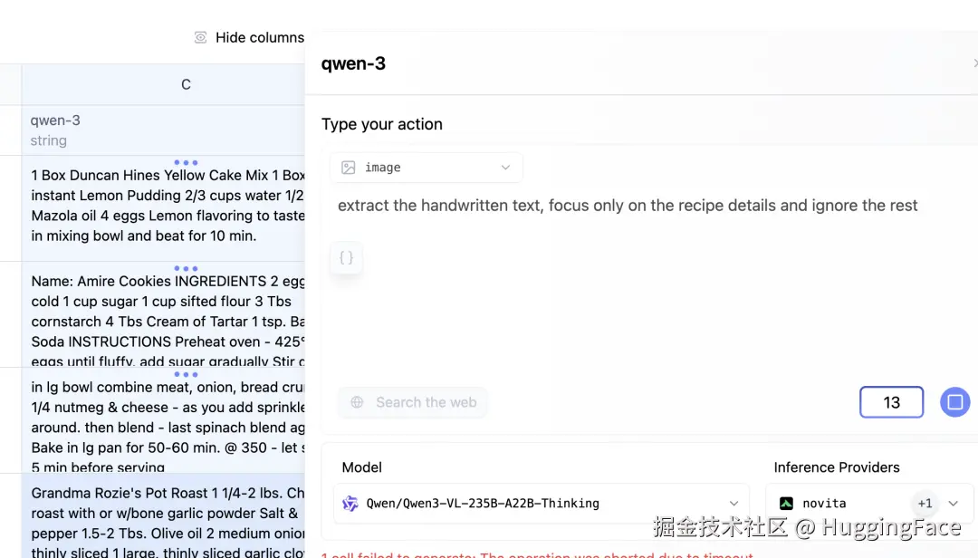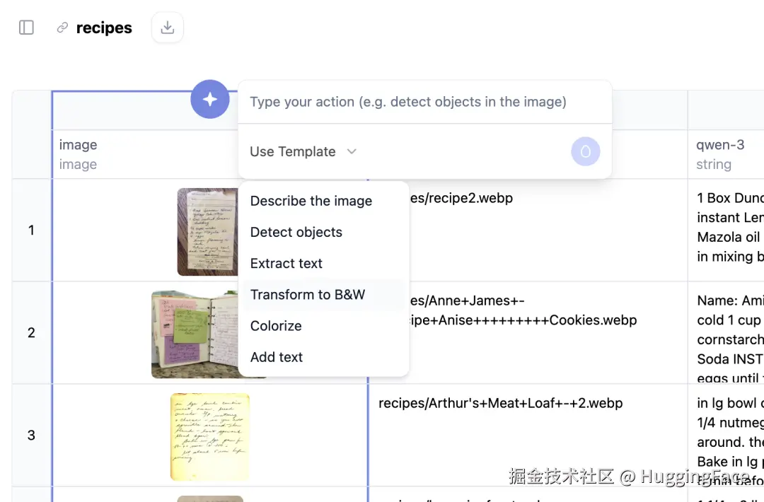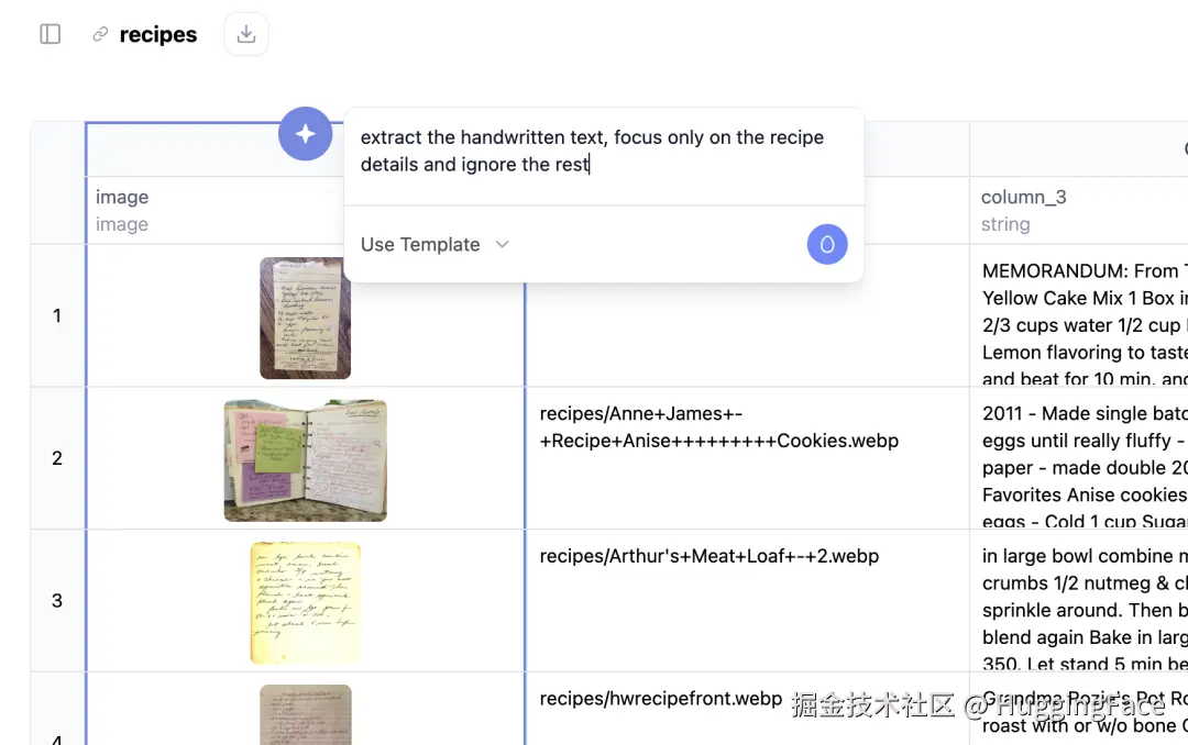 下面我们通过一个实例来看看 AI Sheets 的实际操作。我们将用开源模型来识别祖母笔记本中手写的食谱。