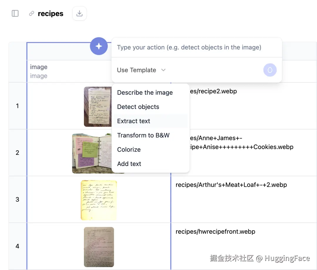 AI Sheets 提供了一个从图像提取文字的模板: