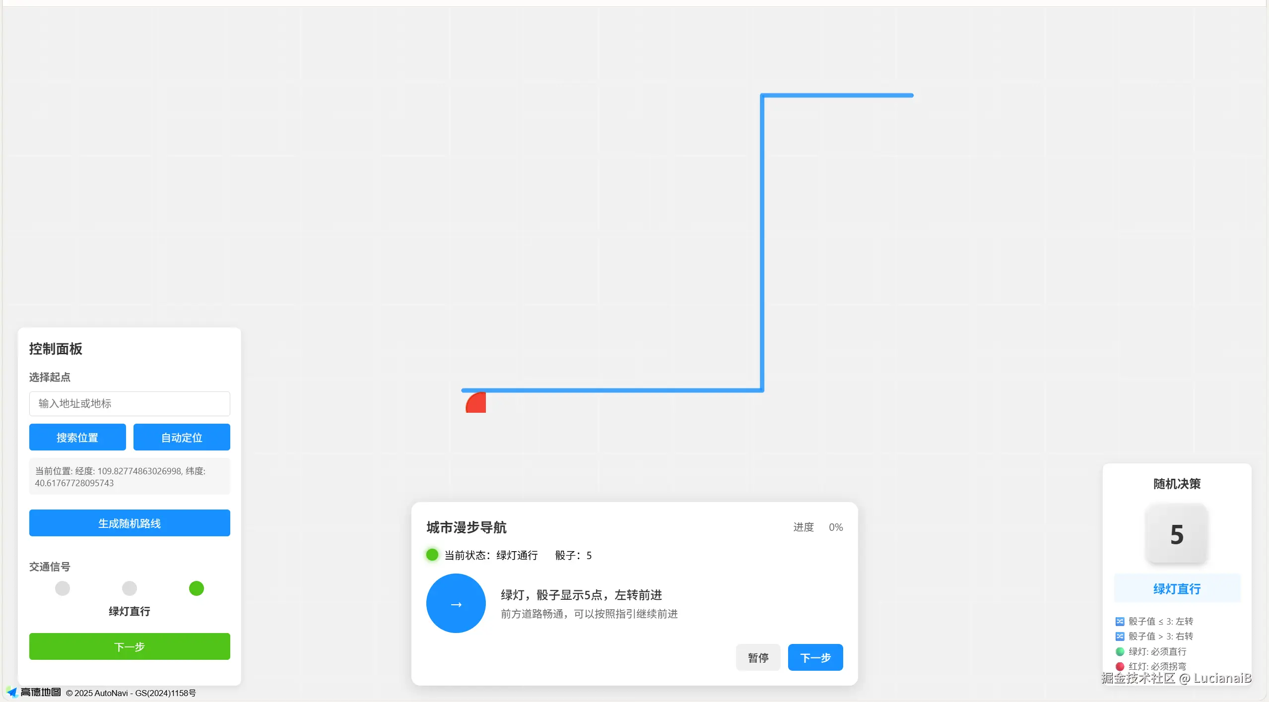 路线生成规则:结合步行路径规划API和随机决策算法,实现仿真“红绿灯”及“猜拳”路口选择。