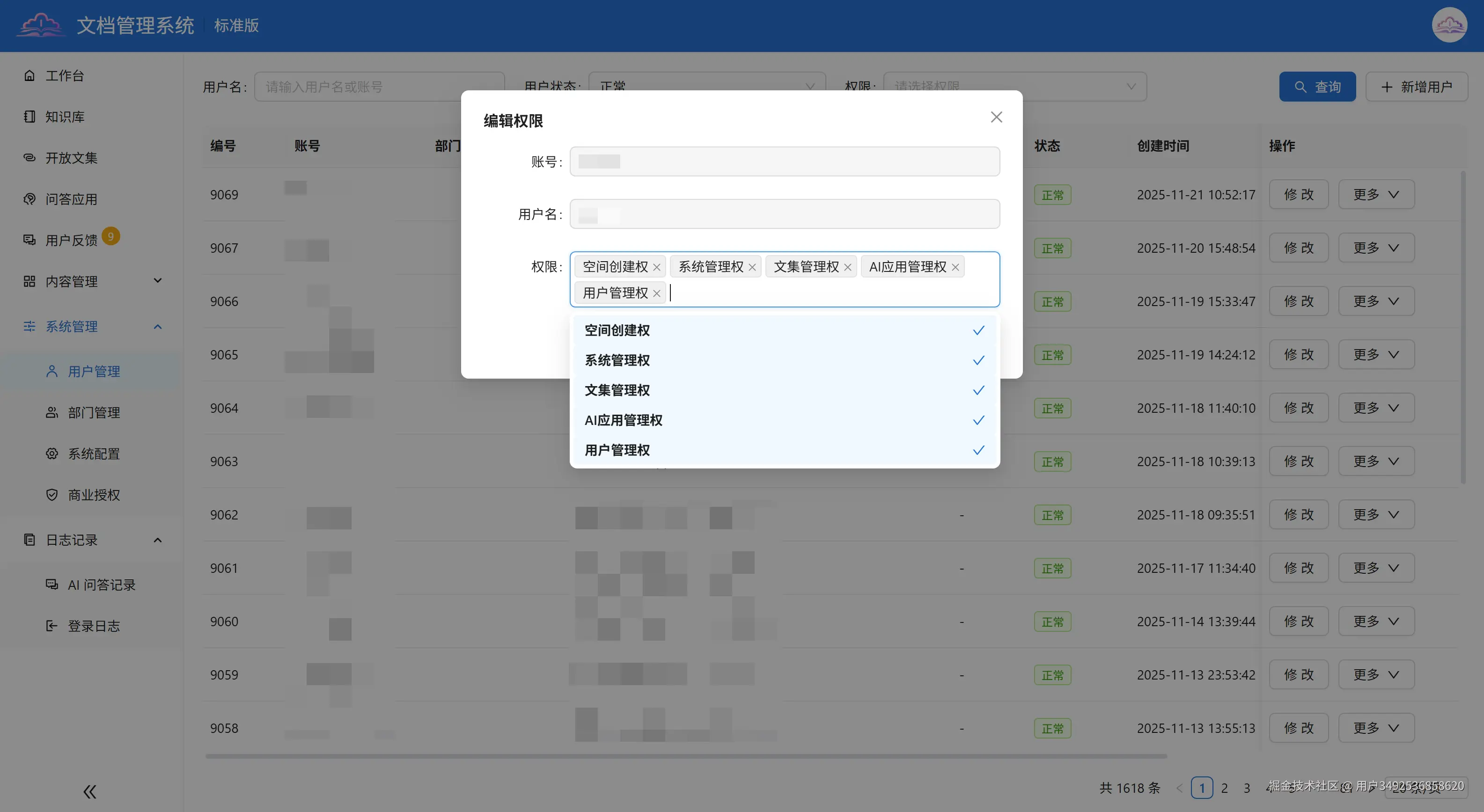 - 细化权限分配:按用户分配多类权限,管理员权限负责系统全管理,用户管理权限专注信息维护,AI管理权限用于AI功能配置优化,确保各模块高效运行。