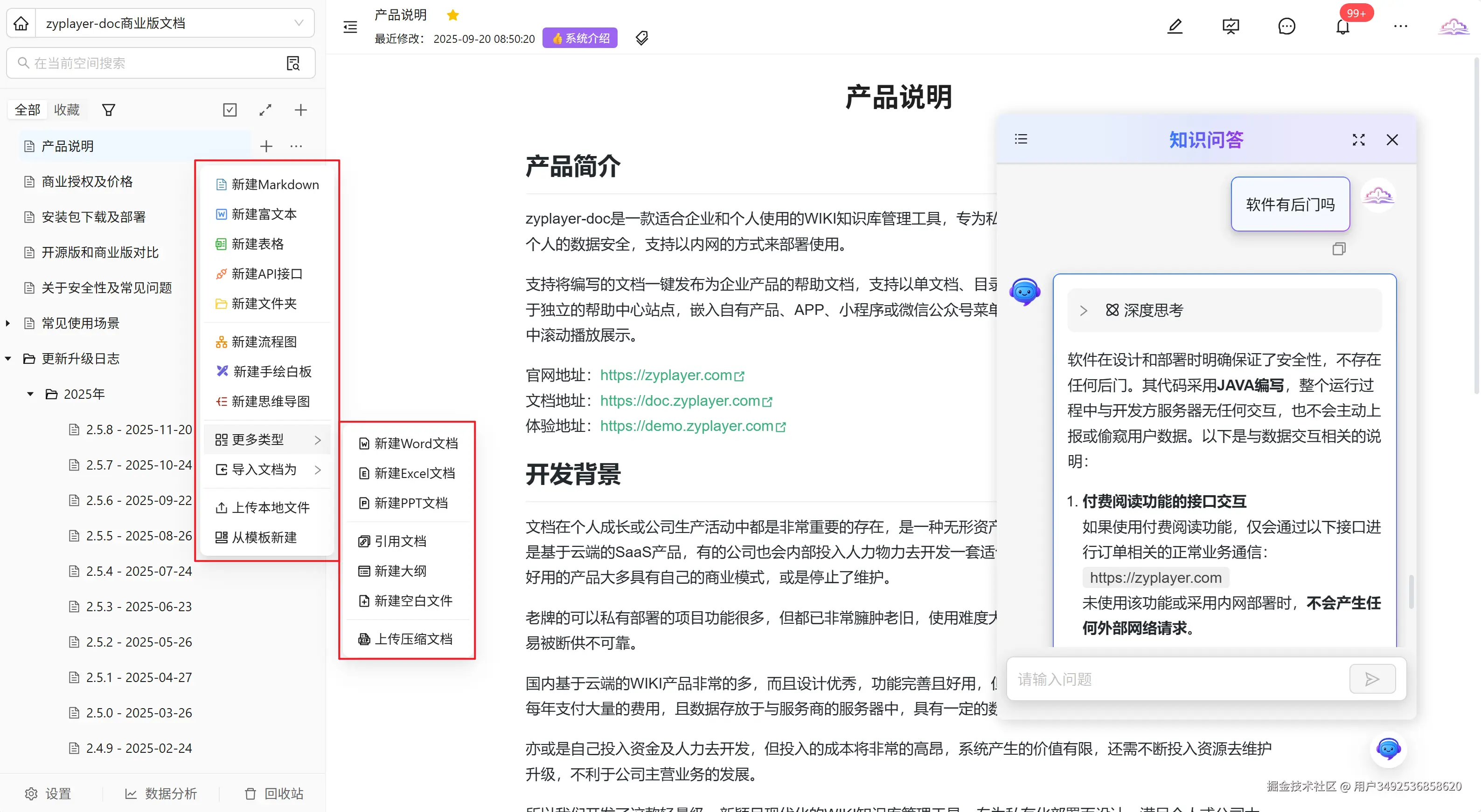 - 便捷的团队协作支持:可按文档添加协作者实现多人共创,通过文档引用机制在共享内容时依据权限控制敏感信息可见范围。
