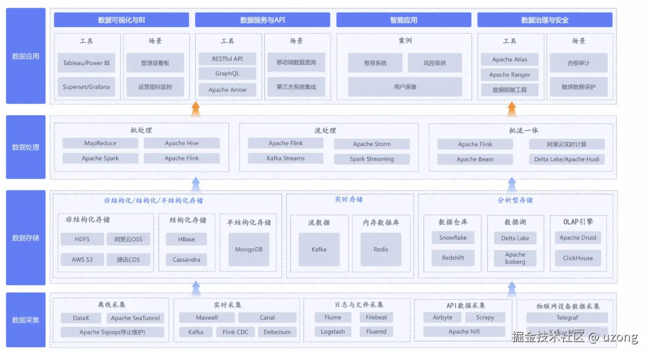 数据存储:存储系统负责持久化数据,包括数据库(如关系型数据库、NoSQL数据库)、数据仓库、数据湖等。