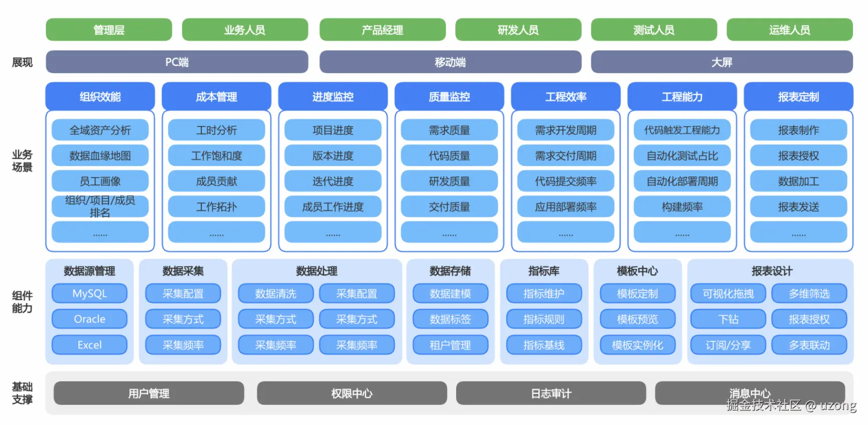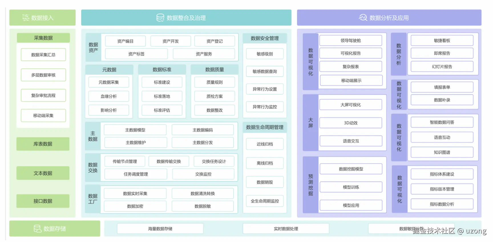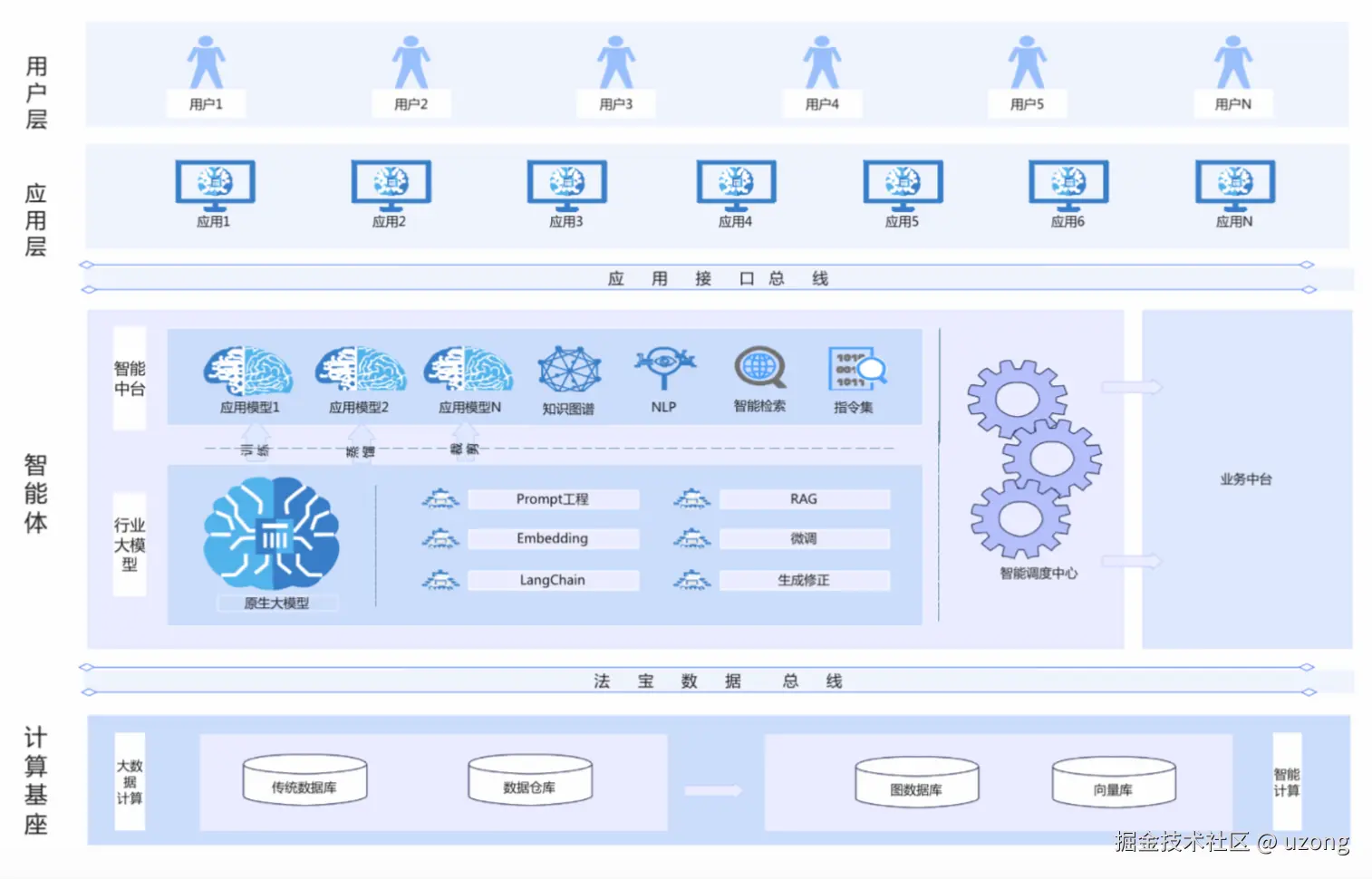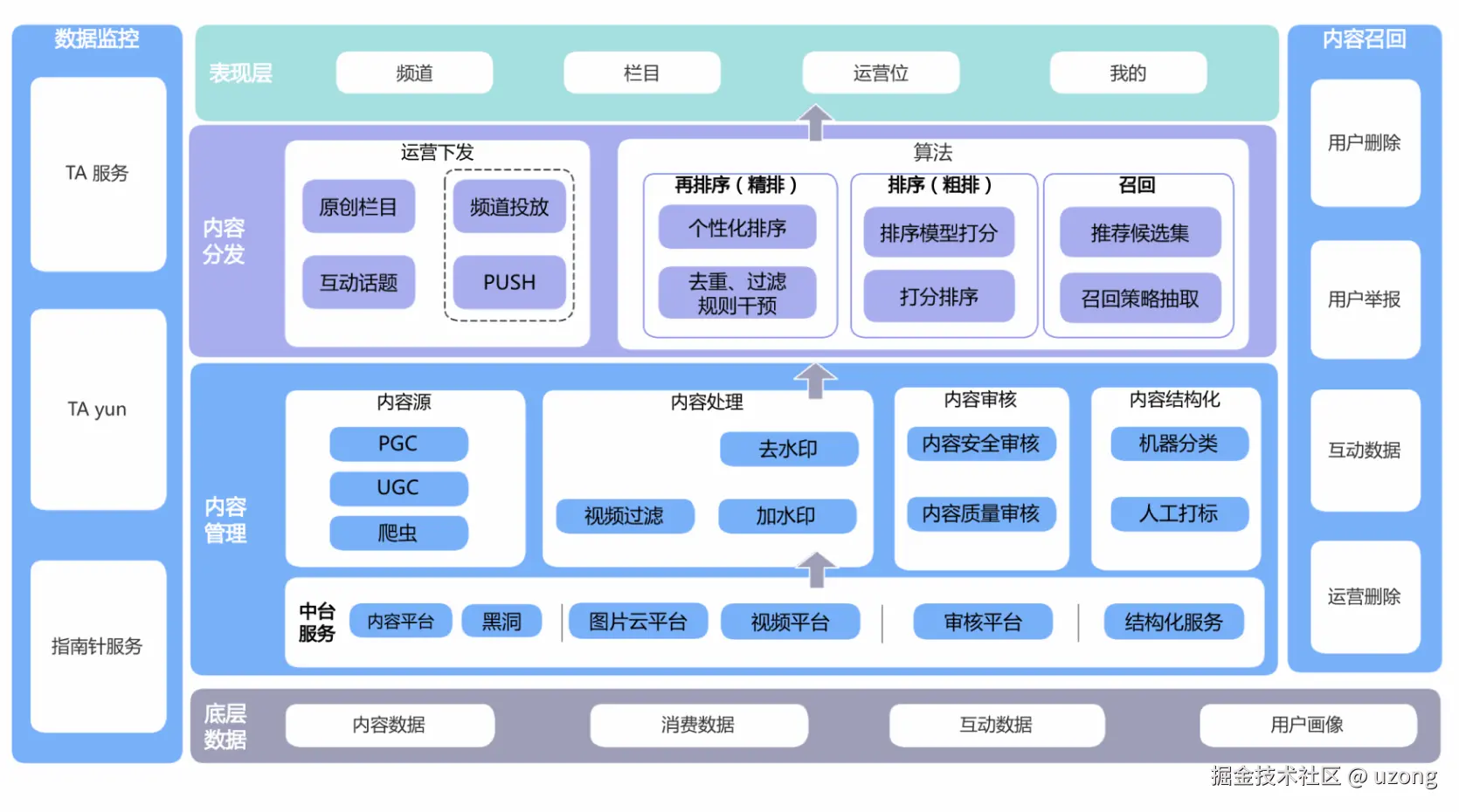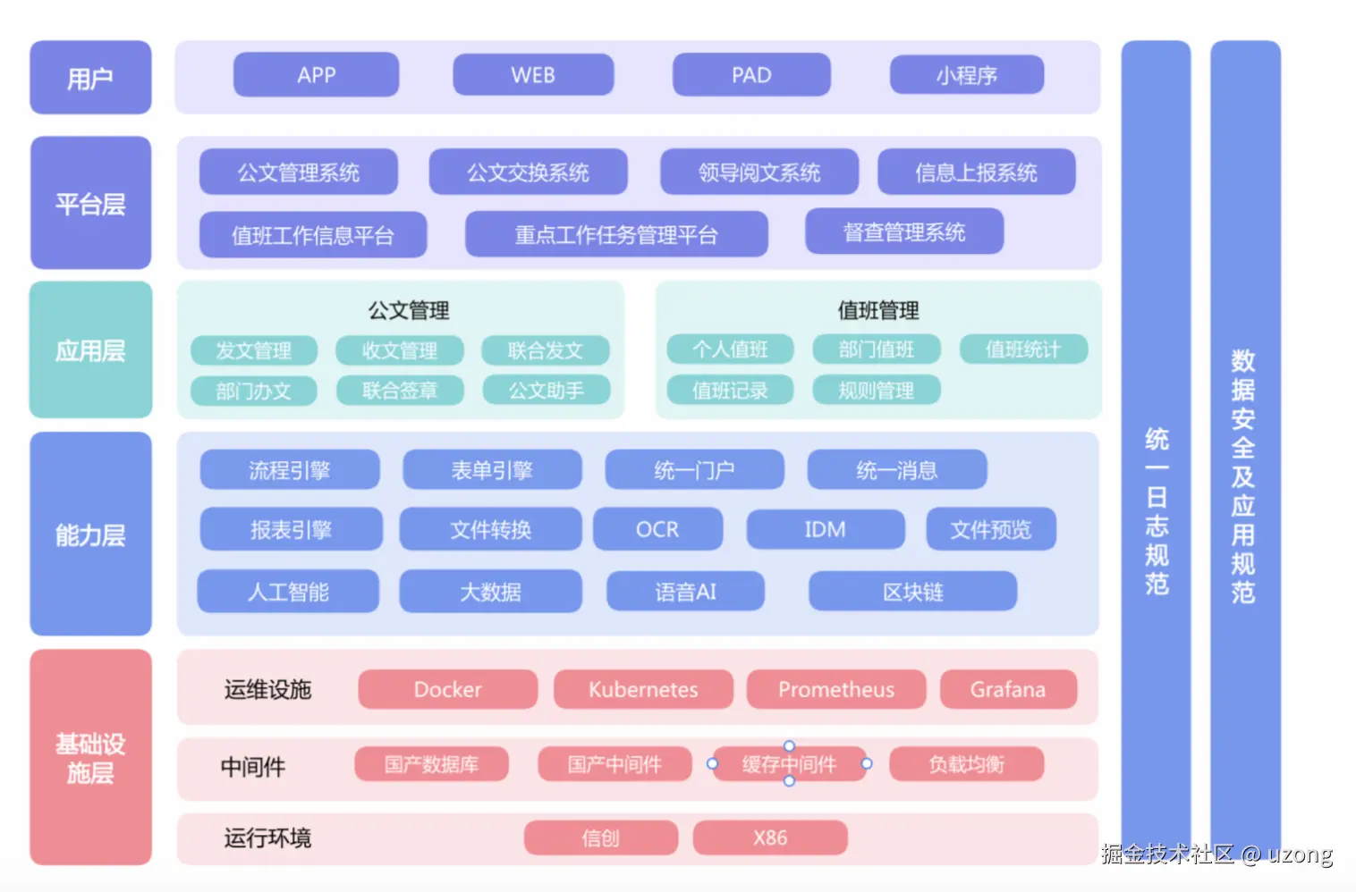 上中下结构:资源层—数据层—平台层—业务层—用户层。