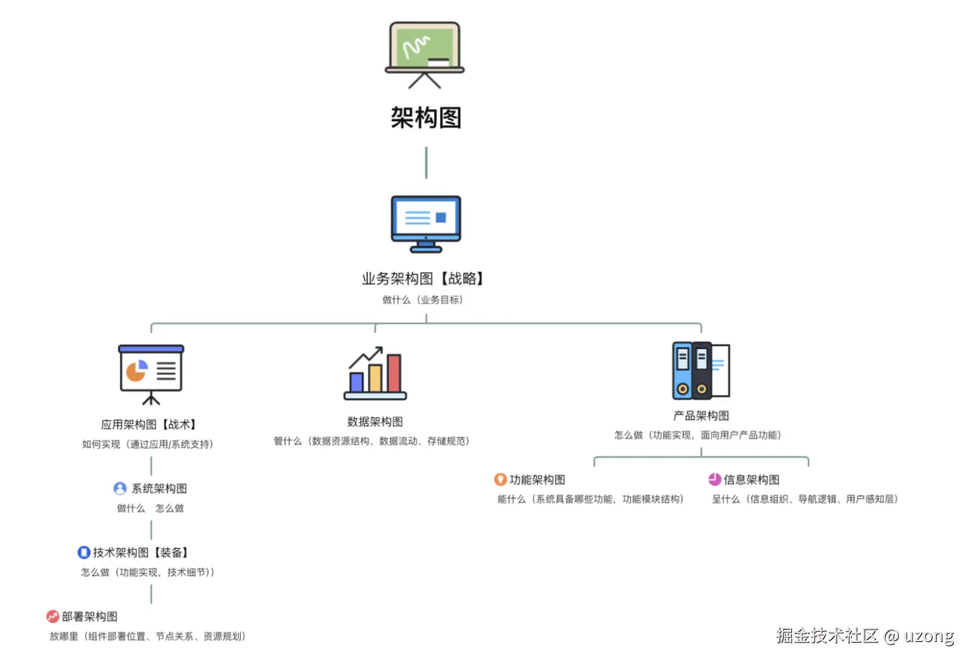 常用的架构图种类有:业务架构图、应用架构图、系统架构图、技术架构图、部署架构图、数据架构图、产品架构图、功能架构图、信息架构图等。