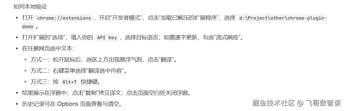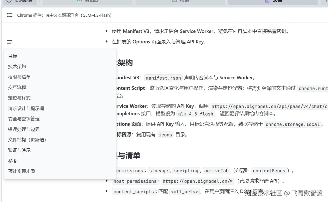我要实现一个chrome 浏览器插件,主要实现网站页面上选中内容的翻译,翻译结果通过浮动弹窗显示在选中内容上方。