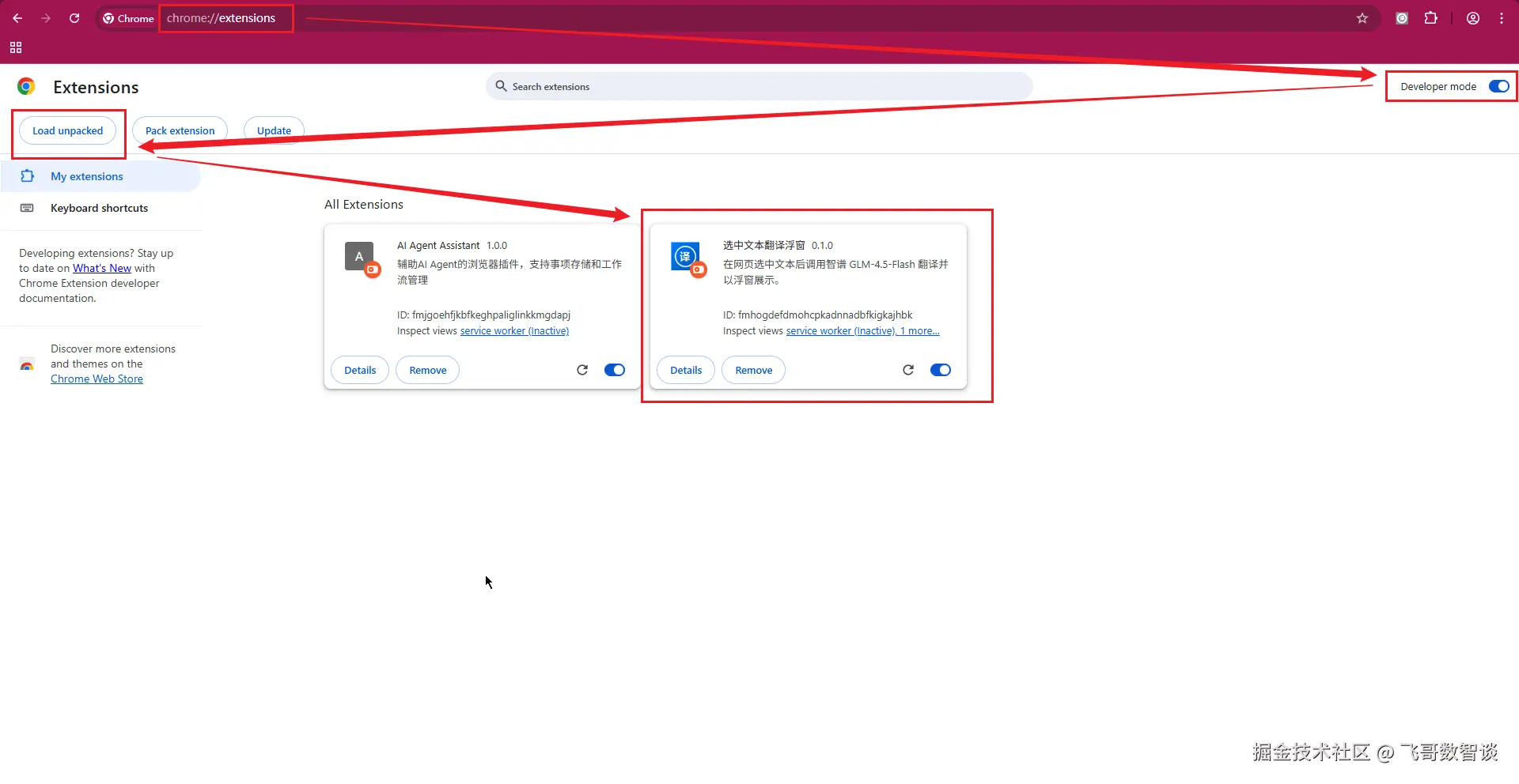 - 右上角“Developer mode”,打开开发者模式;