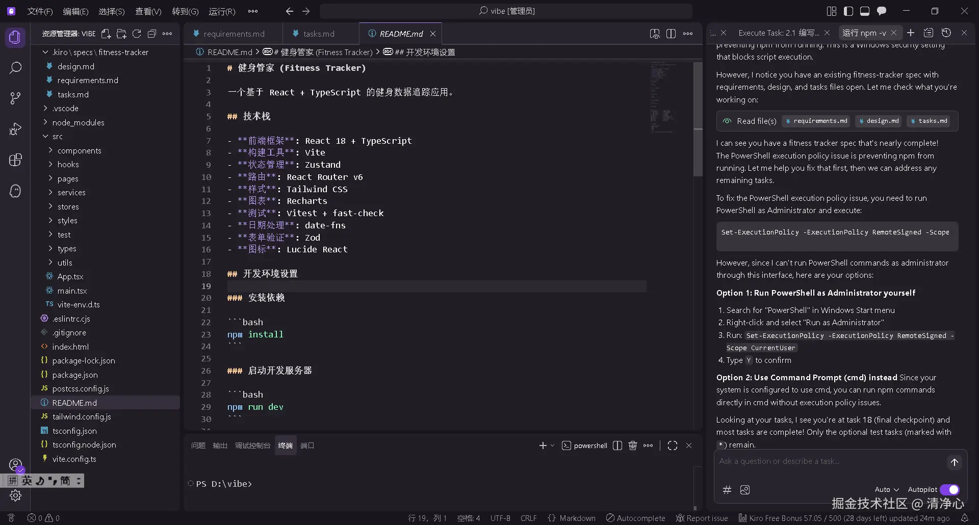 Vibe模式下,输入需求后,Kiro就会直接上手干活,自动生成前后端代码、文件结构。因此,这种模式使用于轻量 AI 辅助的开发场景,比如快速原型、探索性开发等等。特点是操作灵活、快,上手毫无门槛。