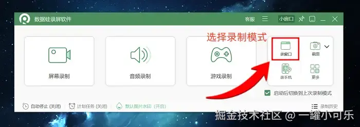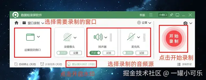 步骤1:打开数据 蛙录屏软件,主界面会呈现完整功能面板。本次重点介绍 “窗口录制” 模式,专门用于精准捕捉指定窗口的画面。