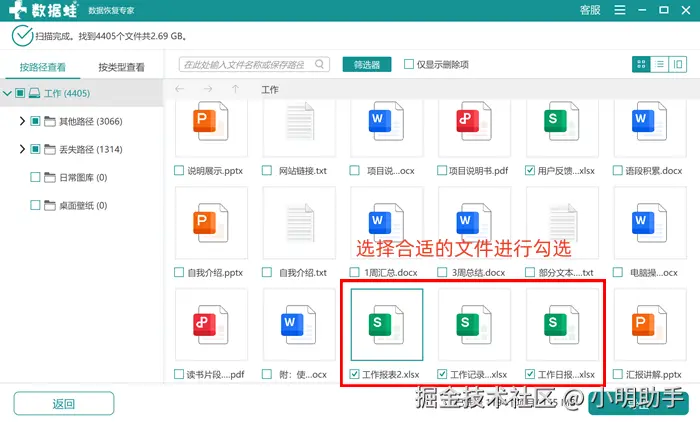 步骤1: 进入软件的首页,我们就可以在指定的位置选择需要恢复的文件(也可以直接在左上角勾选全选),选择好后单击【扫描】进入下一步;