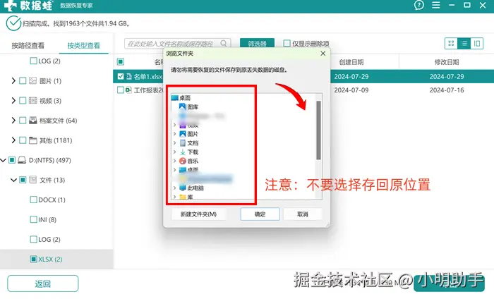 步骤3: 还需要在【浏览文件夹】中选择自己需要恢复文件的存放位置。