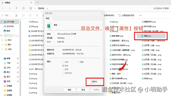 步骤1: 双击打开【回收站】,在里面选择需要恢复的文件,点击打开文件【属性】页面;