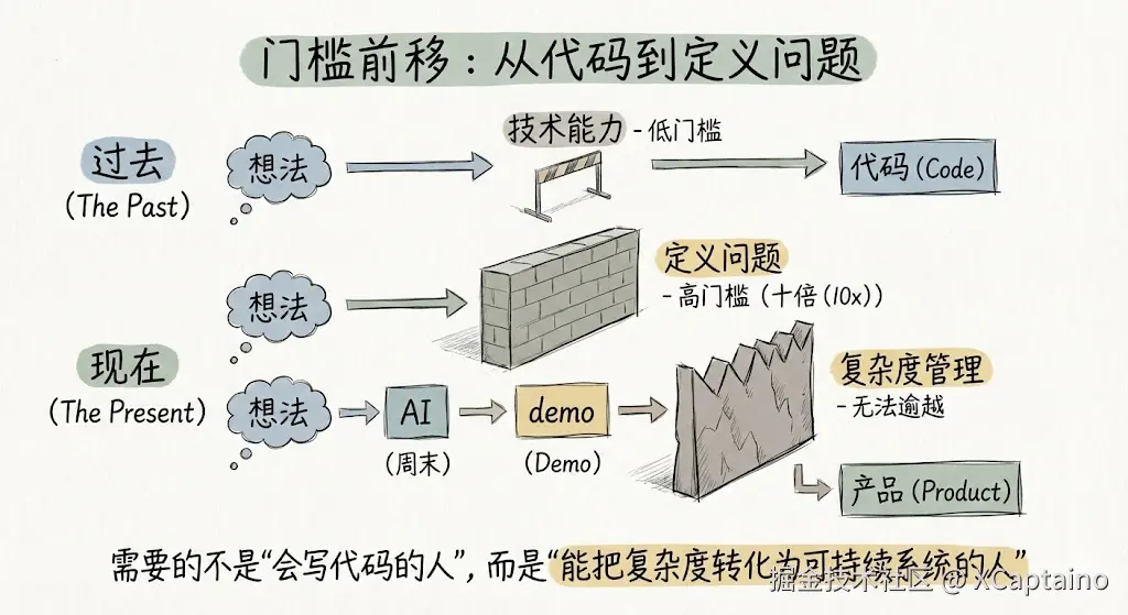 AI 把"写代码"的门槛拉到几乎为零,却把"定义问题"的门槛抬高了十倍。