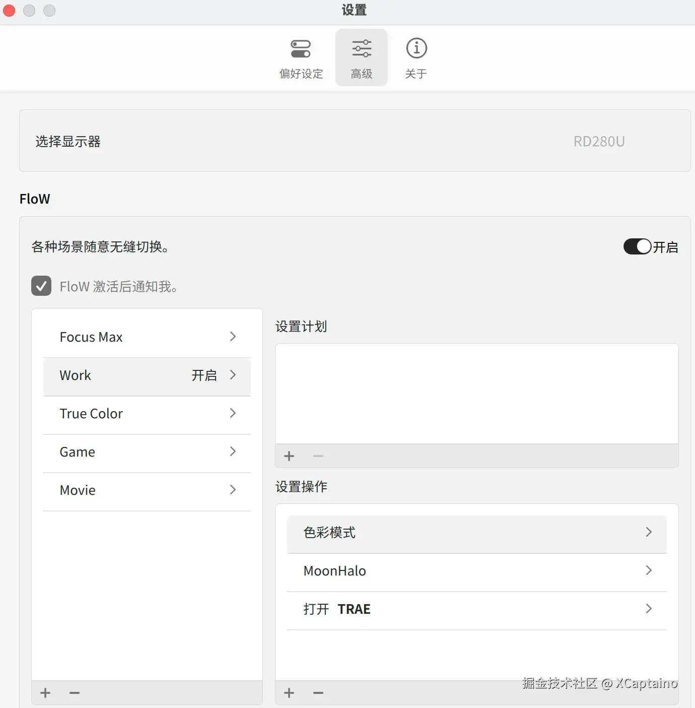 - 可以把"应用 + 画面模式 + 亮度/色温 + MoonHalo 背光开关"打包成一个场景。