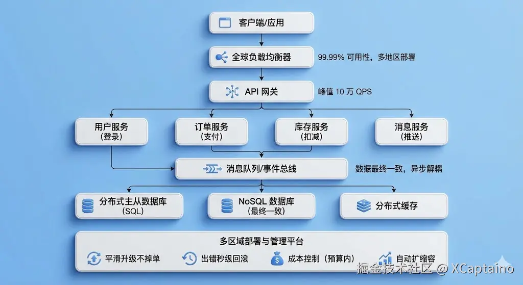但要让它们同时跑起来,还要满足:99.99% 可用性、峰值 10 万 QPS、数据最终一致、支持多地区部署、平滑升级不掉单、出错秒级回滚、成本控制在预算内;这是几百个"简单"必须同时满足的约束条件。