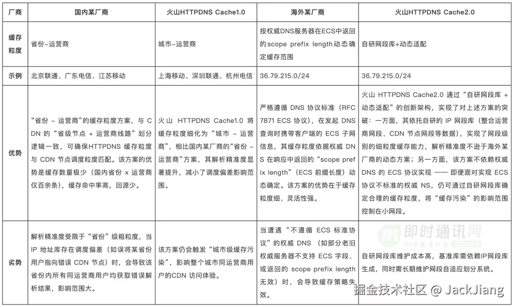 缓存粒度设计直接影响 DNS 解析精准度,主流厂商的方案存在明显差异: