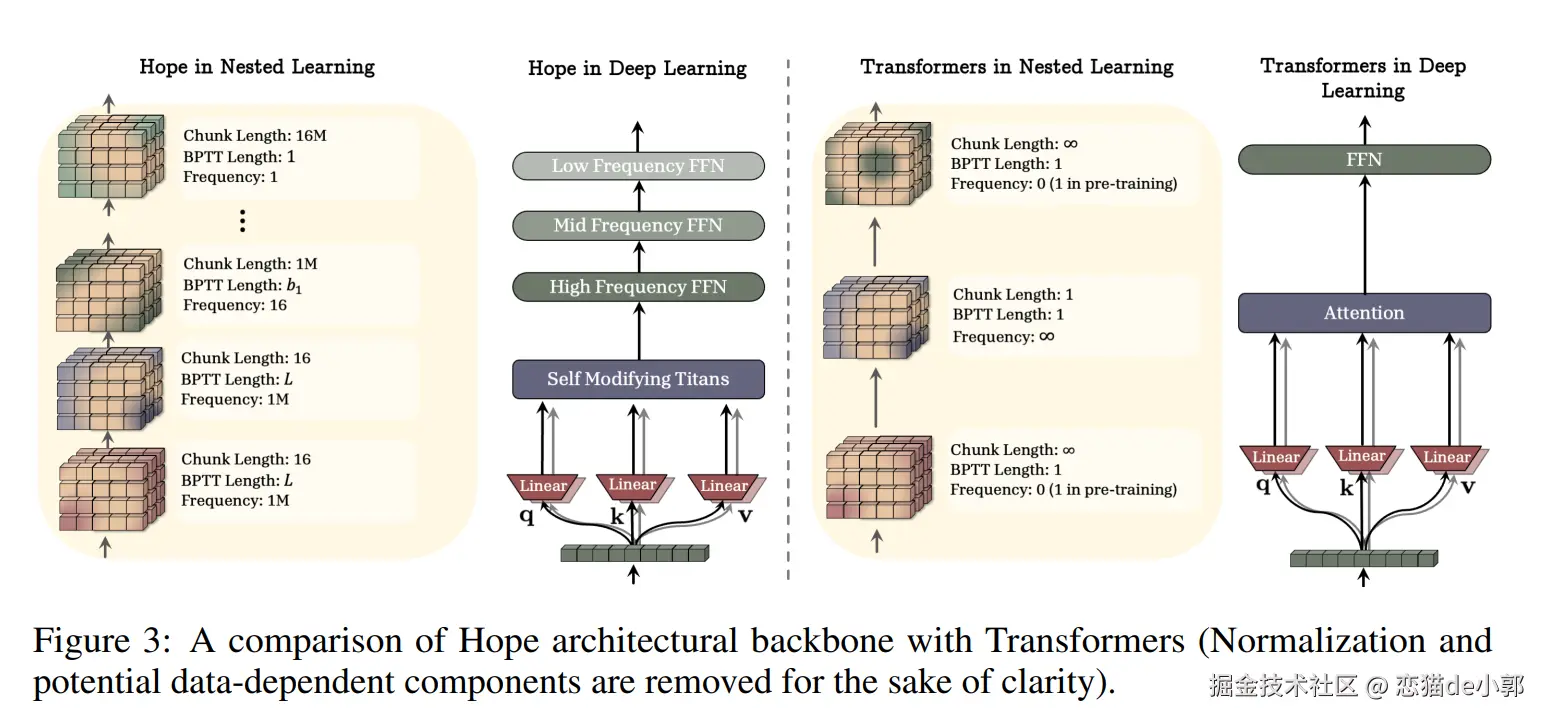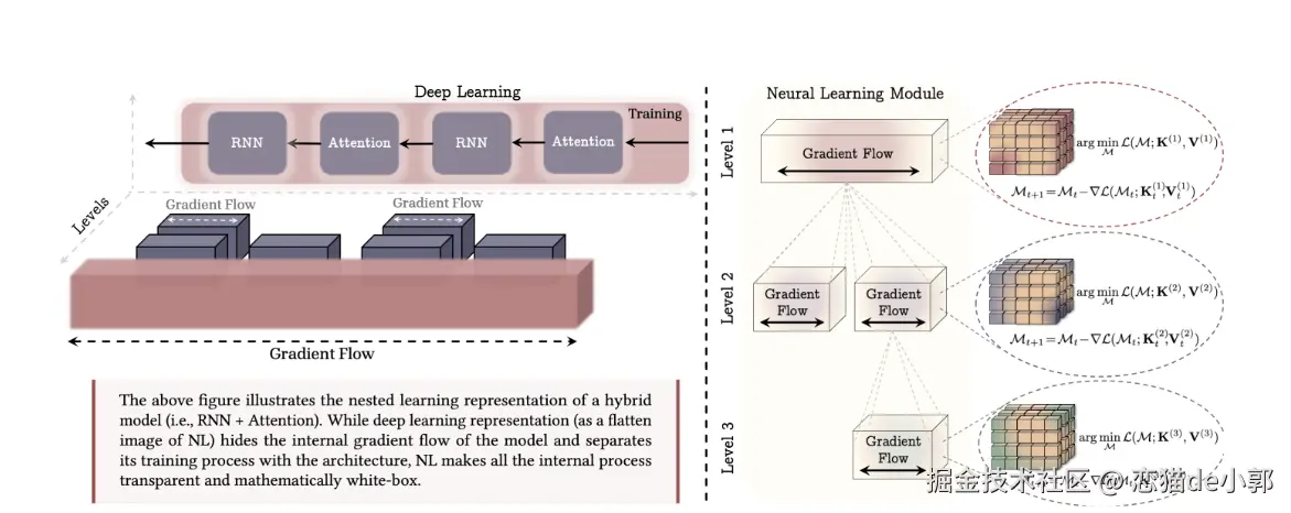 而右图(Neural Learning Module):*是论文的核心视角,它将模型看作一个个嵌套的立方体,每一个立方体代表一个“优化问题” ,从而实现不同 Level 的连续频谱,每一层都有自己的梯度流(Gradient Flow)和更新目标。