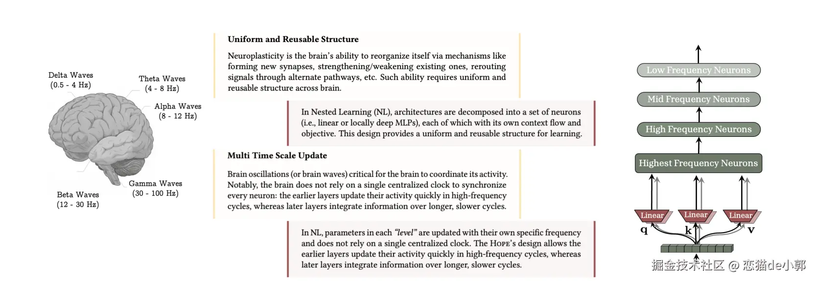 就像人类大脑有不同频率的脑波(Delta波、Theta波、Alpha波等)分别负责不同层级的记忆整合一样 ,模型也应该有不同更新频率的组件。