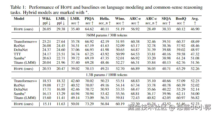 在实验中,HOPE 模型(760M 和 1.3B 参数量)在语言建模和常识推理任务上,击败了同等规模的 Transformer++、RetNet 和 Mamba (Titans) , 更重要的是它展示了更低的困惑度(Perplexity),证明了这种“动态更新”机制的有效性。