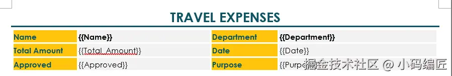 MiniWord 使用类似 Vue, React 的模版字串 {{tag}},只需要确保 tag 与 value 参数的 key 一样(大小写敏感),系统会自动替换字串。