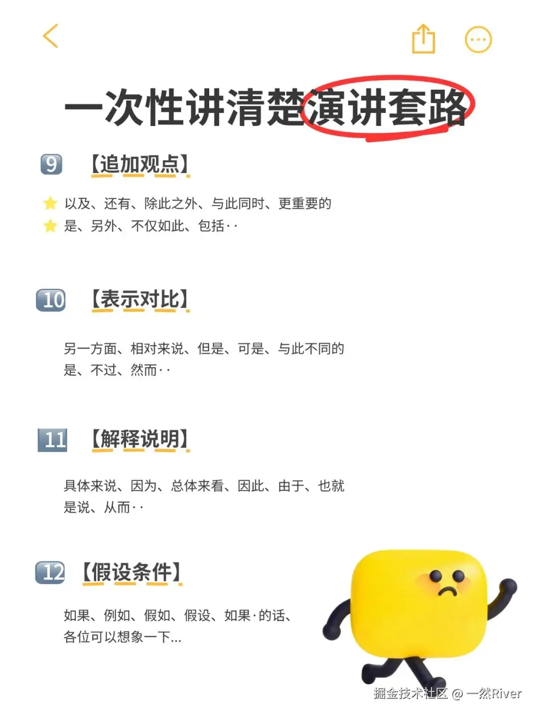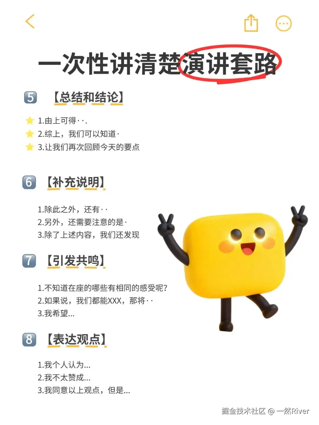 进阶技巧:让 AI 帮你润色!截图 PPT 内容,给 AI 发指令 “帮我写一篇生动又严谨的路演稿,大纲和 PPT 一致”,或者直接上传 PPT,让 AI 生成适配的口语化稿件,修改后反复练习,直到记住逻辑而非逐字内容。