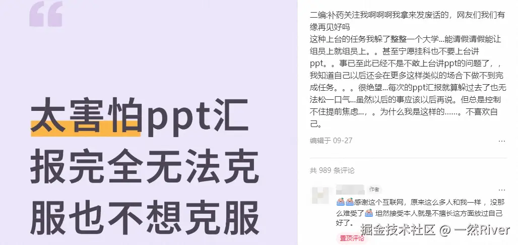 “救命,明天要自己讲 PPT 了,我现在是又烦又害怕紧张的,然后感觉有点困又不敢睡,因为睡醒了就得讲 PPT 了,感觉一个人面对台下的老师和同学让我很害怕。”