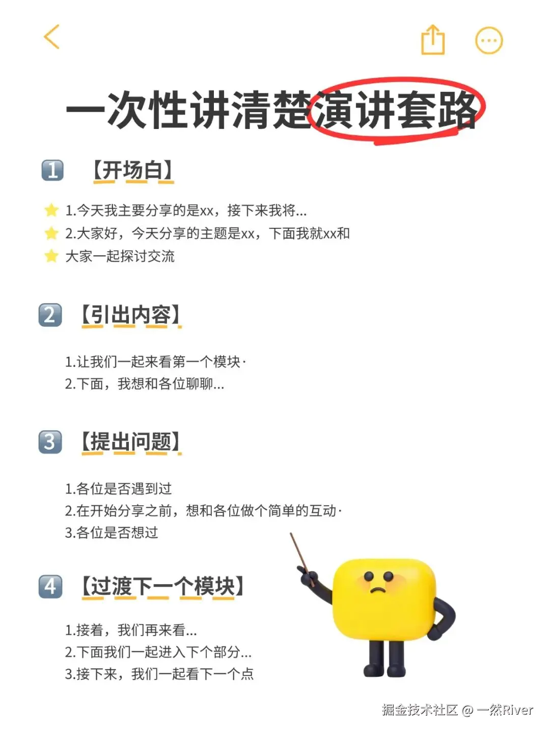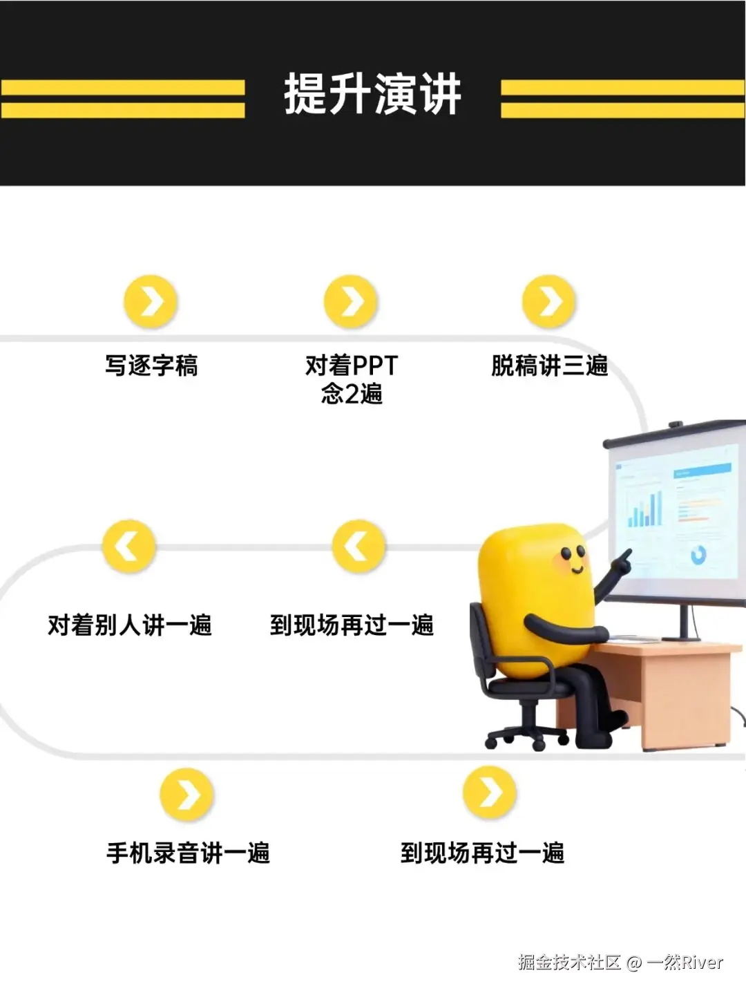 背稿是熟悉内容的第一步,但最终要做到 “脱稿”:看着 PPT 上的关键词,就能联想到相关内容,重点突出、详略得当,根据上一页的内容自然衔接下一页,中间随机加几句串场话,哪怕和之前练的不一样也没关系。