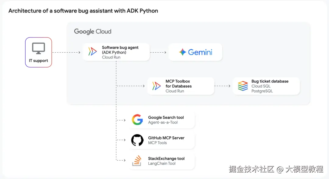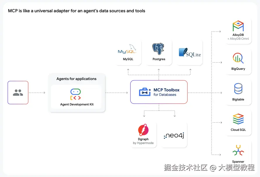 丰富的数据源支持:通过开源MCP Toolbox,支持BigQuery、Bigtable、Cloud SQL、Spanner、MySQL、PostgreSQL等主流数据库,以及新兴的图数据库如Dgraph。