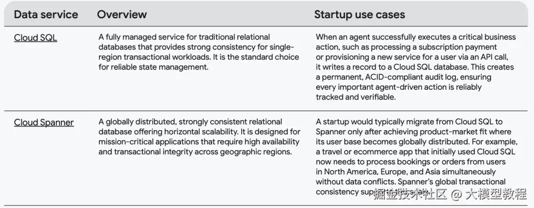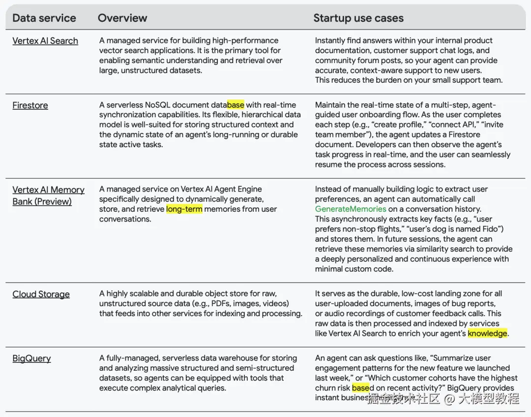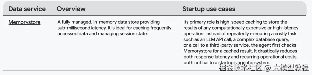 Memorystore:提供毫秒级延迟的高速缓存,存储昂贵操作的结果(LLM调用、复杂查询、第三方服务响应),大幅降低响应延迟和运营成本
