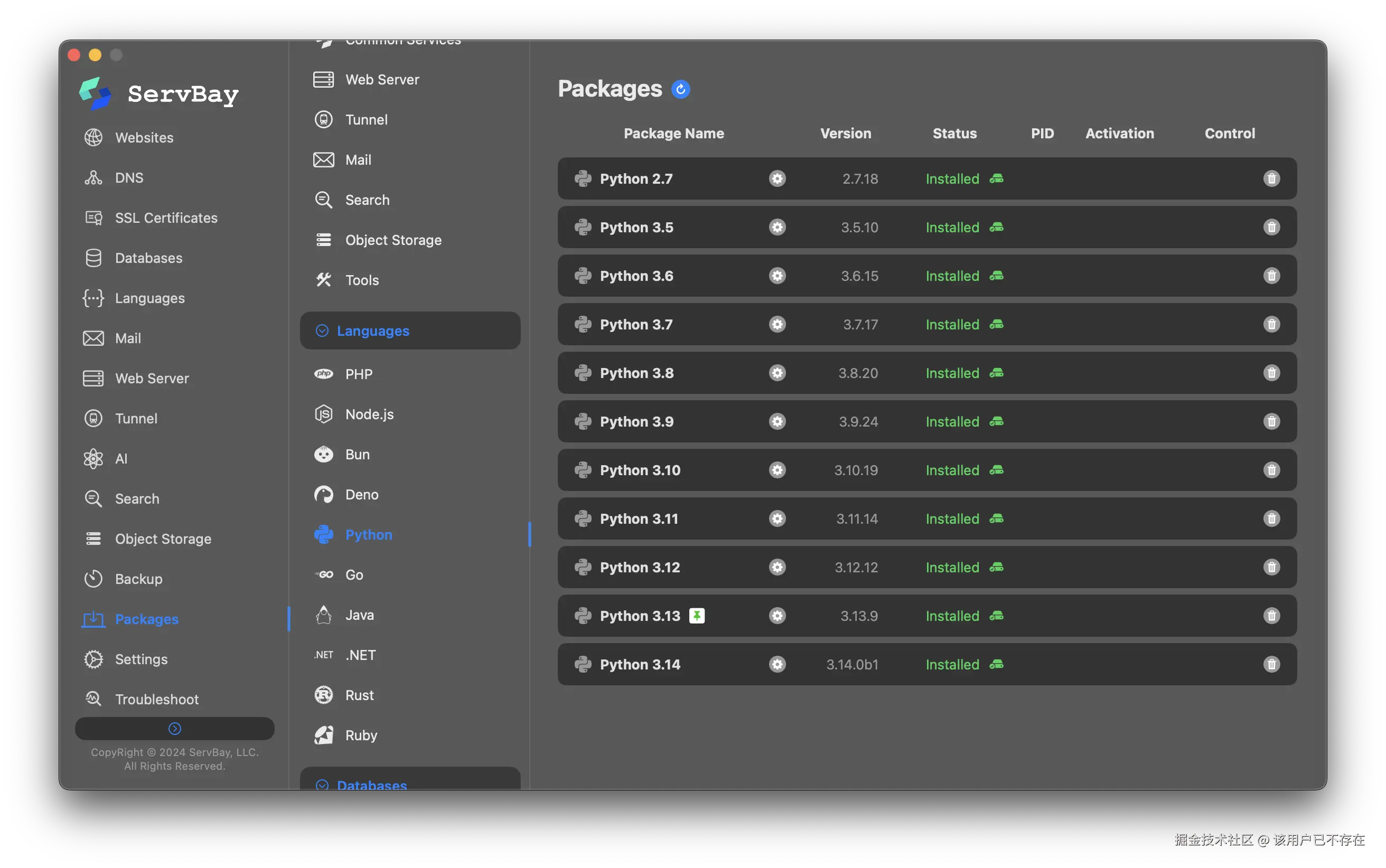 这时候,像 ServBay 这样的集成开发环境工具就派上用场了。它把程序员常用的开发语言和工具都打包好了,可以一键安装。比如想用Python,它直接就提供了,只需要点击下载就行,而且支持多个Python版本自由切换,甚至可以同时运行,这对于维护老项目和开发新项目简直太方便了。