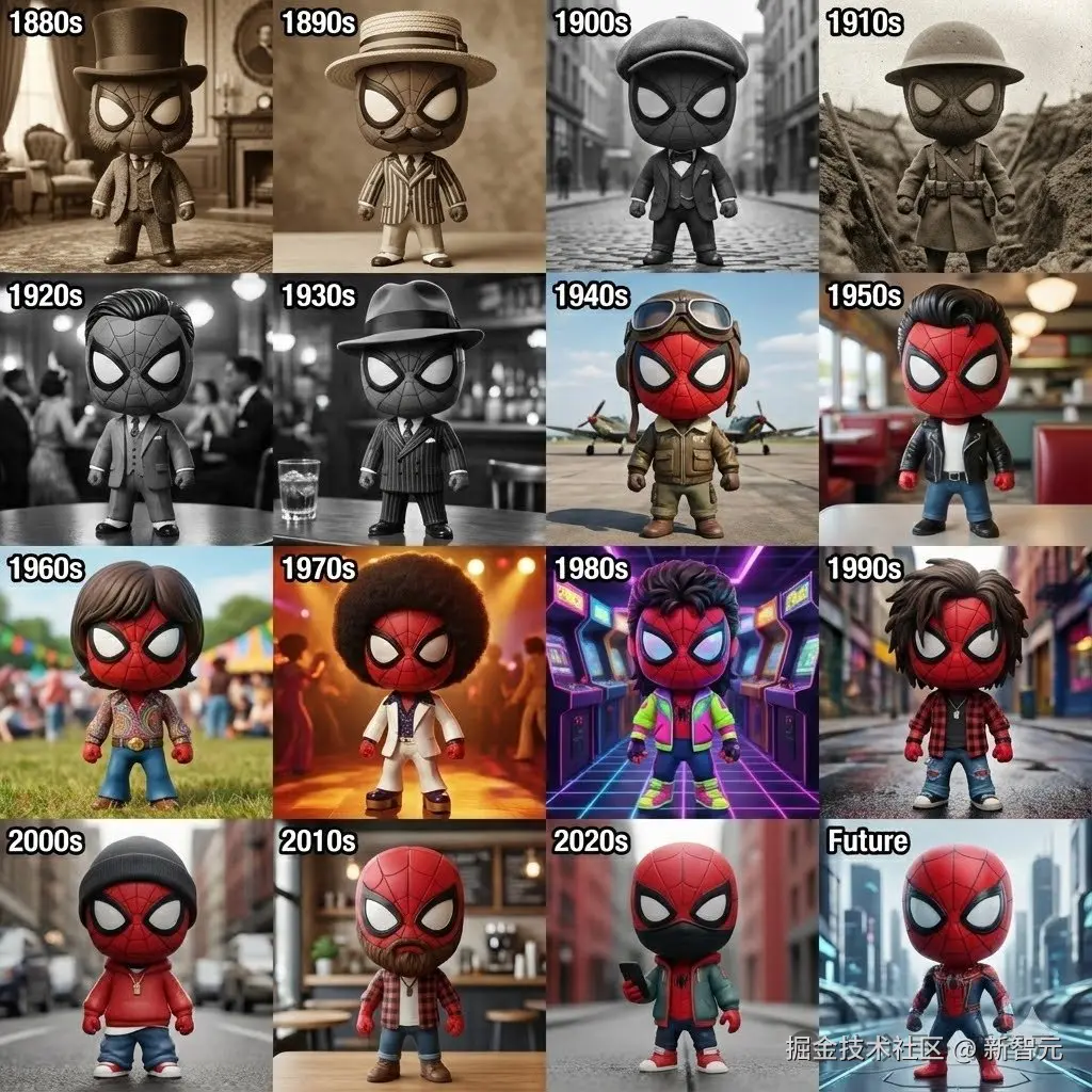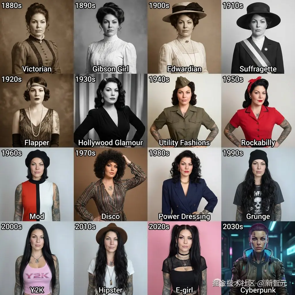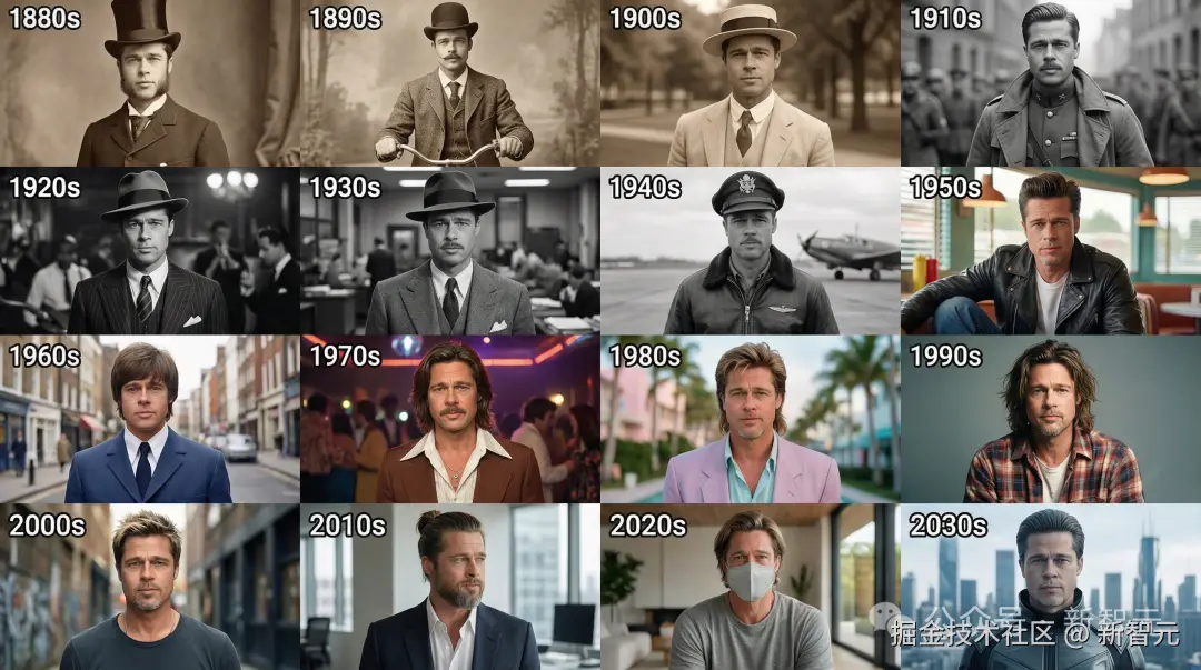 从 1880 年代开始,Nano Banana Pro 连续生成每隔十年人物的形象。