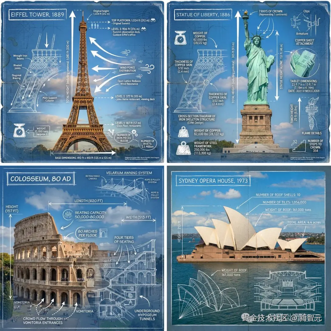 还有著名地标信息图,埃菲尔铁塔、悉尼歌剧院、自由女神像、罗马斗兽场,