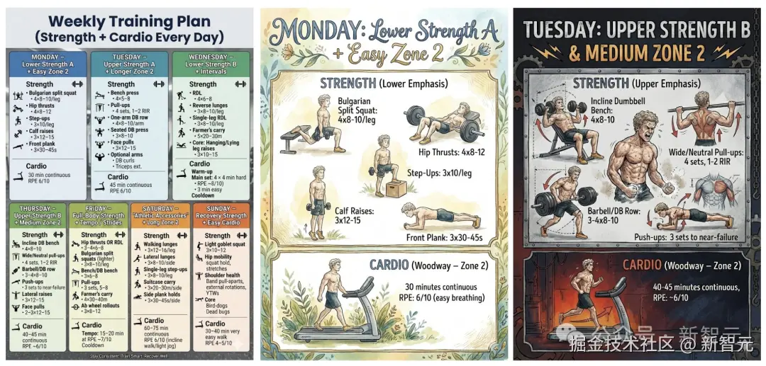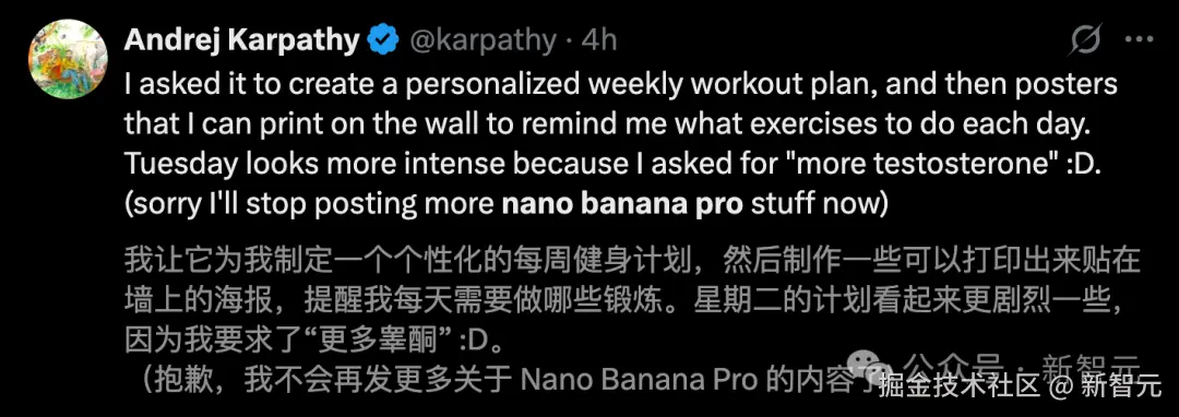 有趣的是,Karpathy 还特意让 Nano Banana Pro 把计划设计得更「睾酮爆表」,没想到,AI 直接在周二计划中直接上强度了。