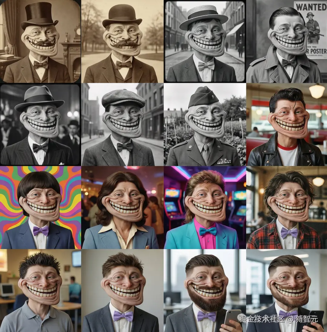 网友 Blaine Brown 上传了一张照片后,Nano Banana Pro 生动刻画了不同年代,人物服装打扮的特点。