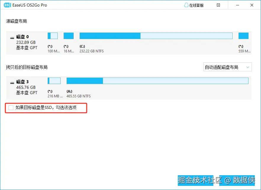 步骤 3. 调整磁盘布局。目标驱动器上的默认磁盘布局将与资源驱动器完全相同。您还可以根据需要编辑布局。如果您使用固态硬盘作为 Windows 可启动驱动器,请勾选该选项。接下来,单击“继续”。