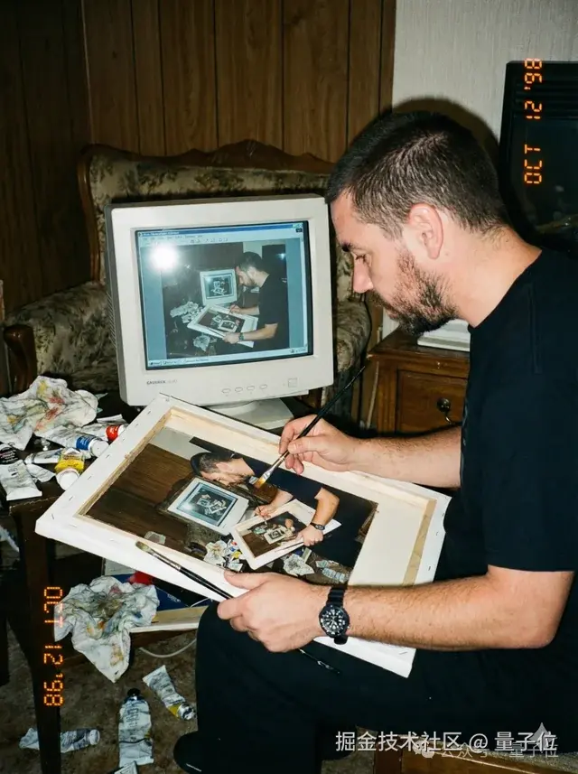 老式显示器发出的光晕,画布下溅上去的颜料,还有画面右下方那个傻瓜相机的时间戳……r/ChatGPT 像欣赏一张传世名画一样把这张图放大看了 20 分钟。