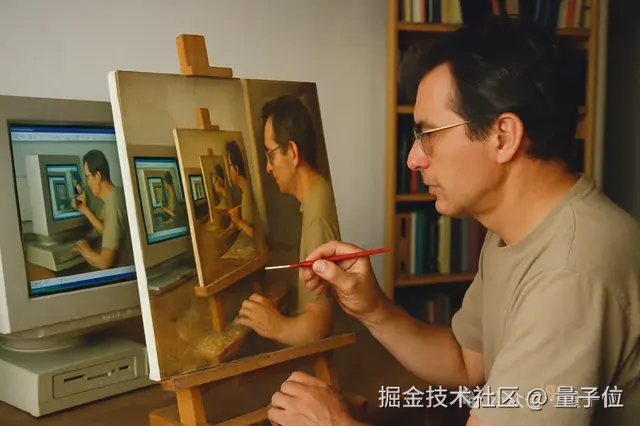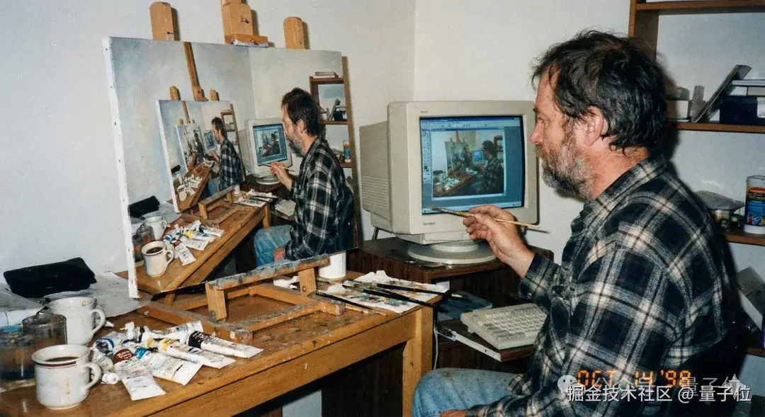1998 年的一张业余摄影作品。画面中,一位中年艺术家正在将电脑屏幕上的图像亲手复制到一张绷好的油画布上,但这个图像本身其实就是这位艺术家绘制该递归图像时的拍摄画面。